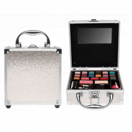 Hliníkový mini kosmetický kufřík se stříbrným povrchem. Obsah: 1 x zrcátko, 14 x barvy očních stínů, 3 x třpytivé barvy na rty, 1 x tvářenka, 1 x pudr, 1 x rtěnka, 1 x lak na nehty, 1 x štětec na tvářenku, 1 x houbičkový aplikátor a 1 x štětec na rty.