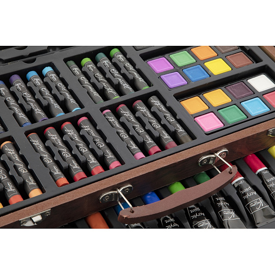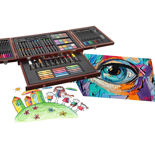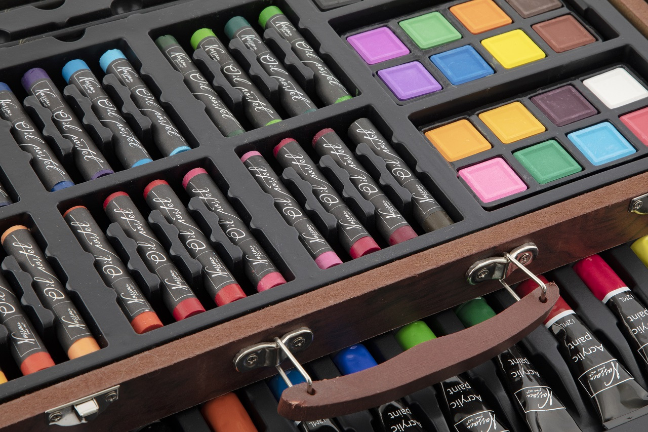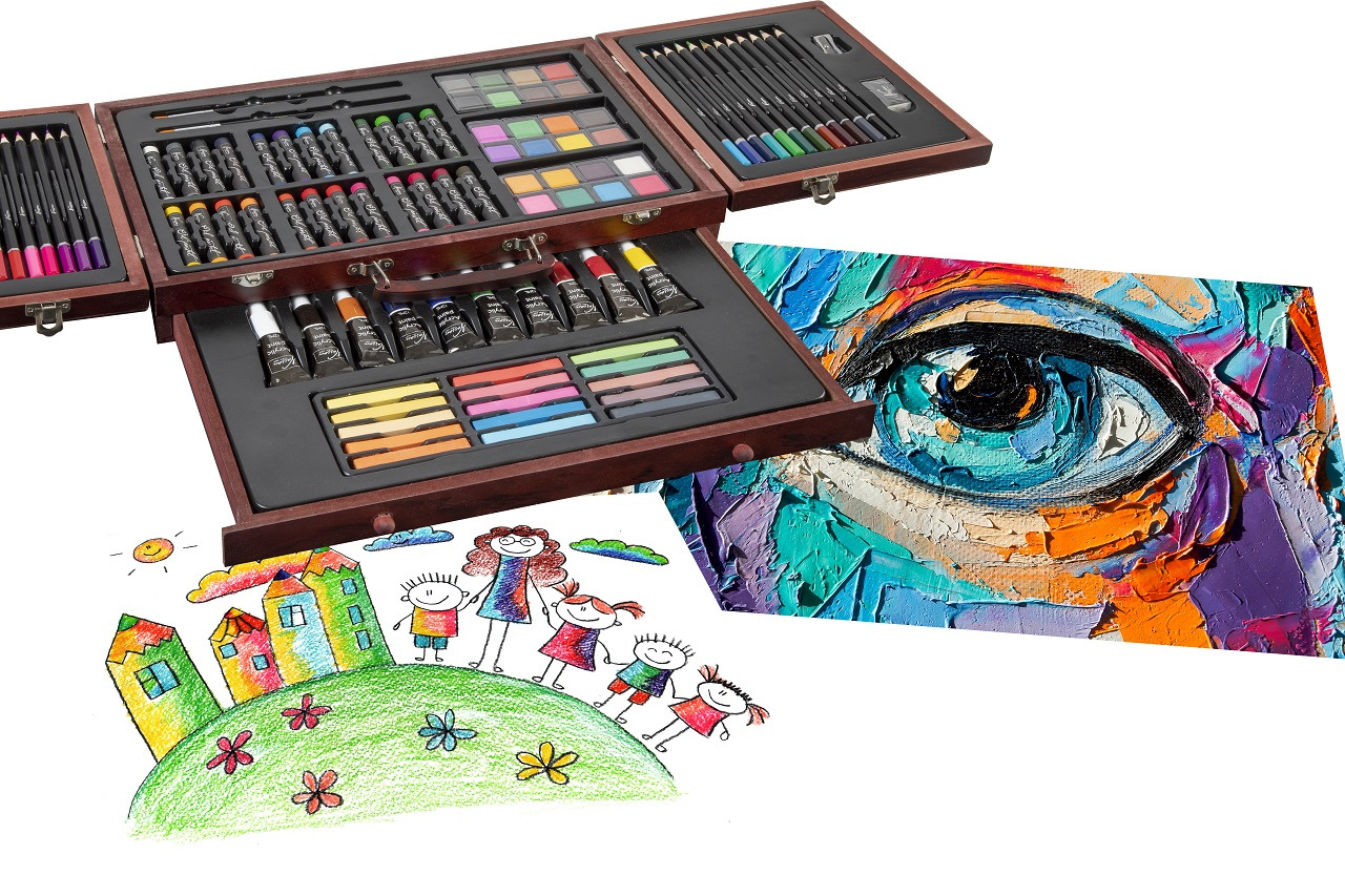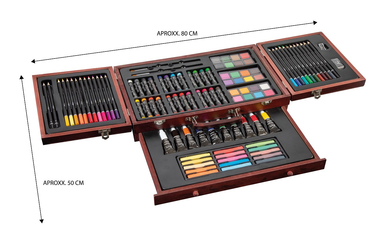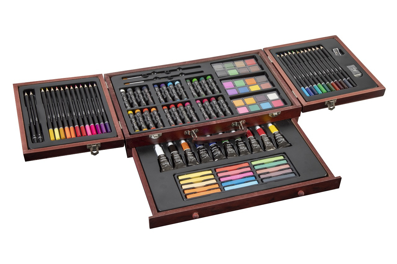 Velká sada na kreslení a malování. Pastelky, vodovky…. Vše uloženo v dřevěném kufříku.