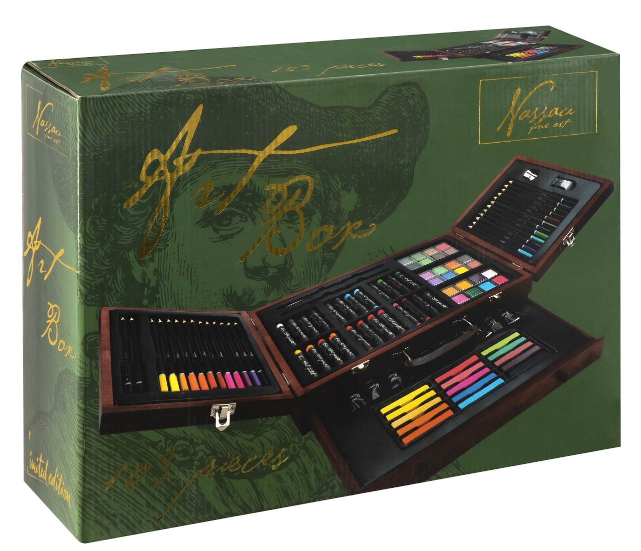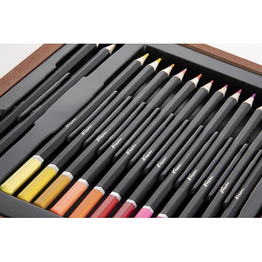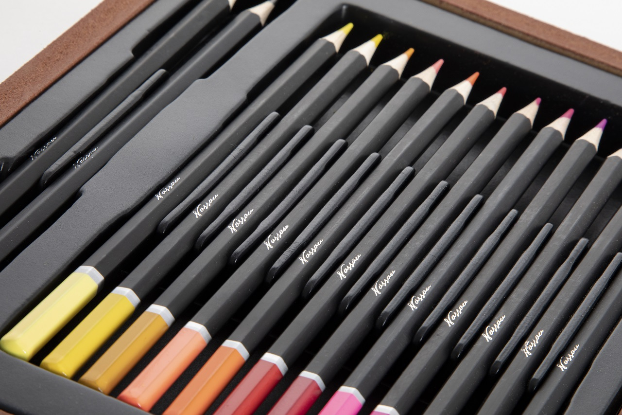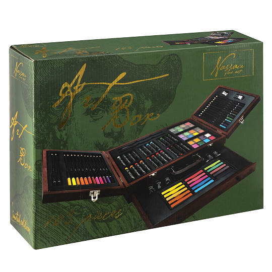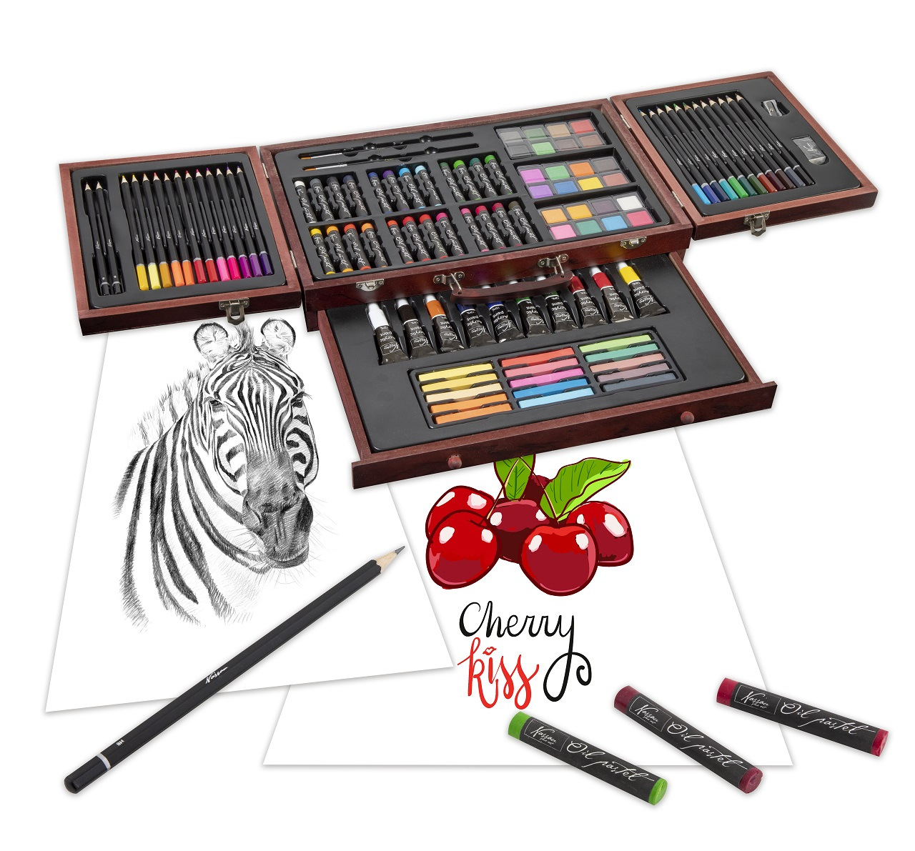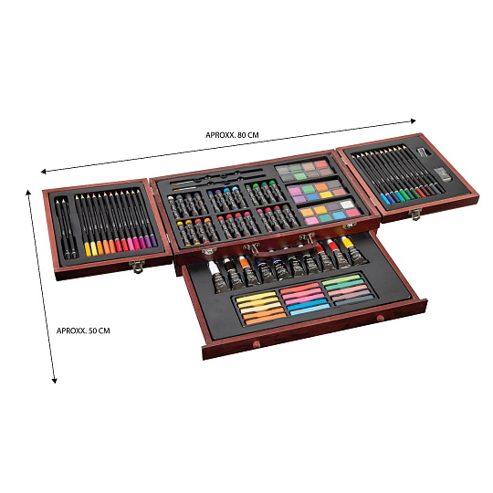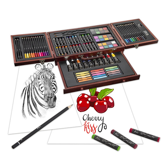 Velká sada na kreslení a malování. Pastelky, vodovky…. Vše uloženo v dřevěném kufříku.