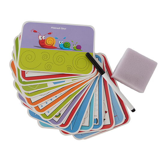 Edukativní sada kreslení linek trénuje šikovnost a soustředěnost dítěte. Uči děti být pečlivý a trpělivý. Sada obsahuje 16 výukových kartiček, speciálni fix, který jde smazat a houbičku. Kartičky jsou opakovatelně použitelné.