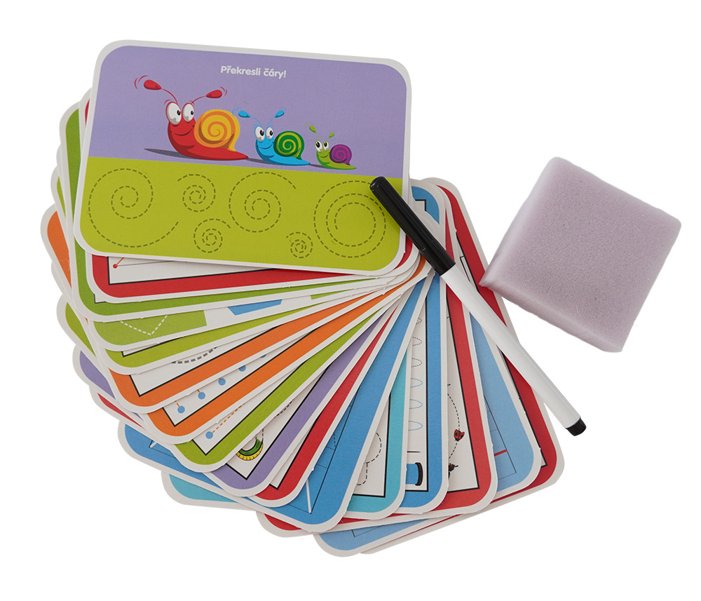Edukativní sada kreslení linek trénuje šikovnost a soustředěnost dítěte. Uči děti být pečlivý a trpělivý. Sada obsahuje 16 výukových kartiček, speciálni fix, který jde smazat a houbičku. Kartičky jsou opakovatelně použitelné.