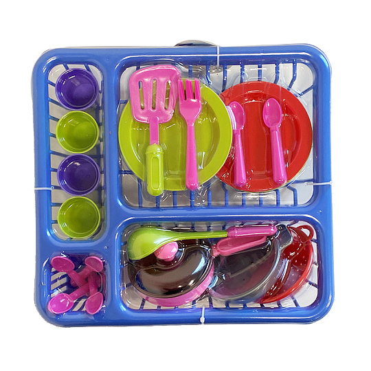 Plastová sada do kuchyňě obsauje odkapávač, hrníčky, talíře, příbory, kuchyňské náčiní.