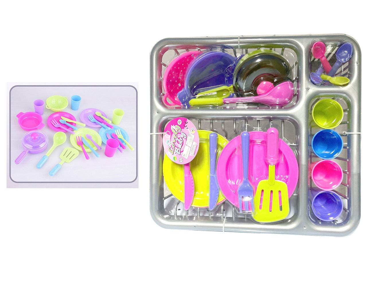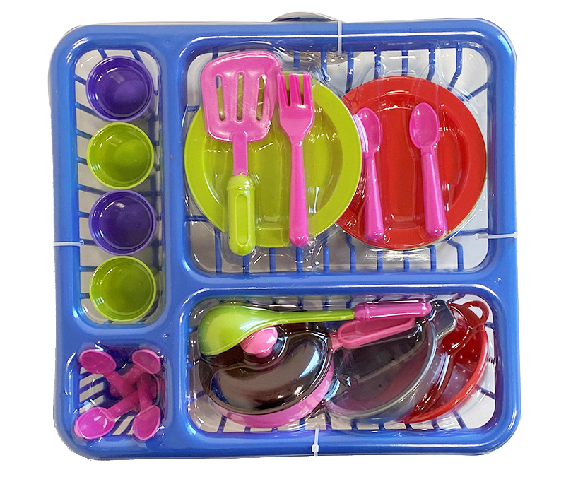 Plastová sada do kuchyňě obsauje odkapávač, hrníčky, talíře, příbory, kuchyňské náčiní.