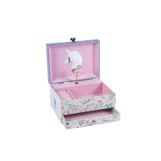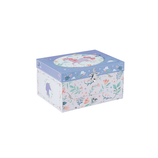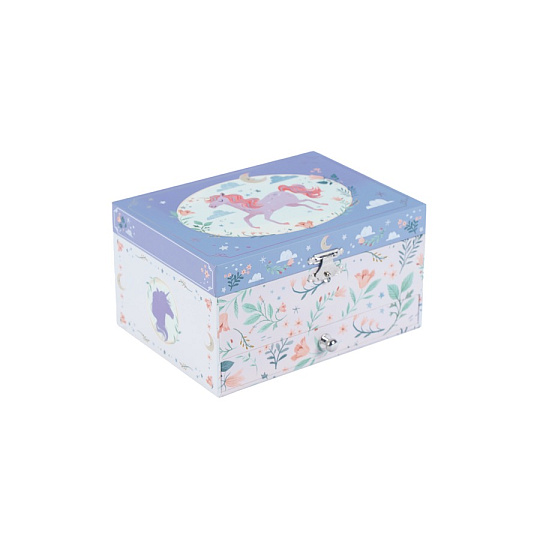Hrací skříňka s jednorožcem, který se točí. Skříňka po otevření hraje a jednorožec se točí. Vyrobeno z tvrdého odolného papíru.