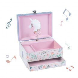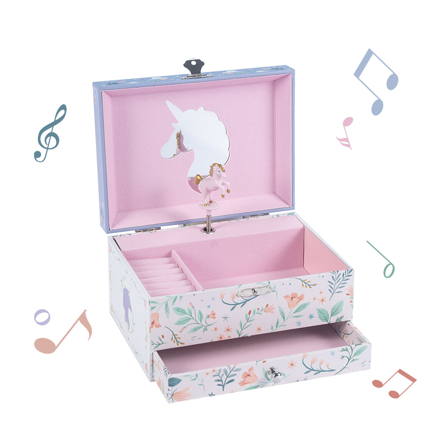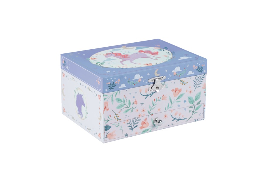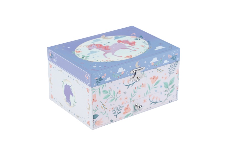 Hrací skříňka s jednorožcem, který se točí. Skříňka po otevření hraje a jednorožec se točí. Vyrobeno z tvrdého odolného papíru.