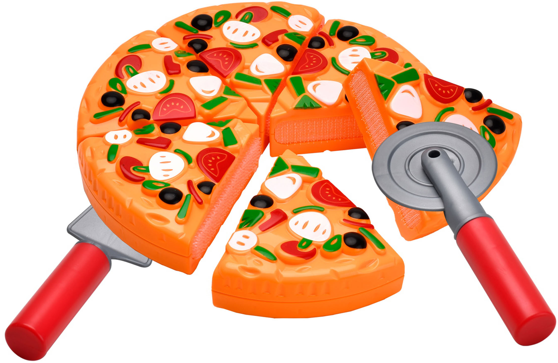 Pizzu na suchý zip: Pizza je rozdělena na dílky spojené suchým zipem, což dětem umožňuje zábavné "krájení".