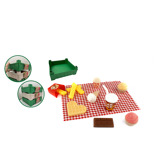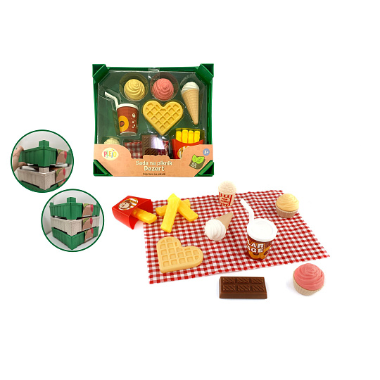 Sladké pohoštění: Sada obsahuje vše, co potřebujete pro sladké piknikové posezení. Děti si mohou připravit a "servírovat" různé dezerty, které vypadají jako skutečné.