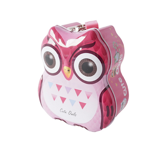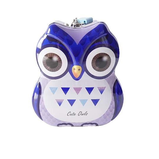 Malá kovová pokladnička se zámkem ve tvaru sovy. Děti učí si střádat své úspory.