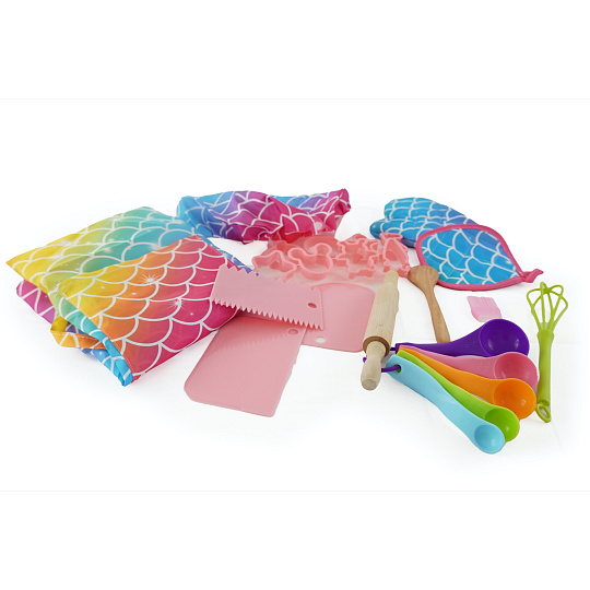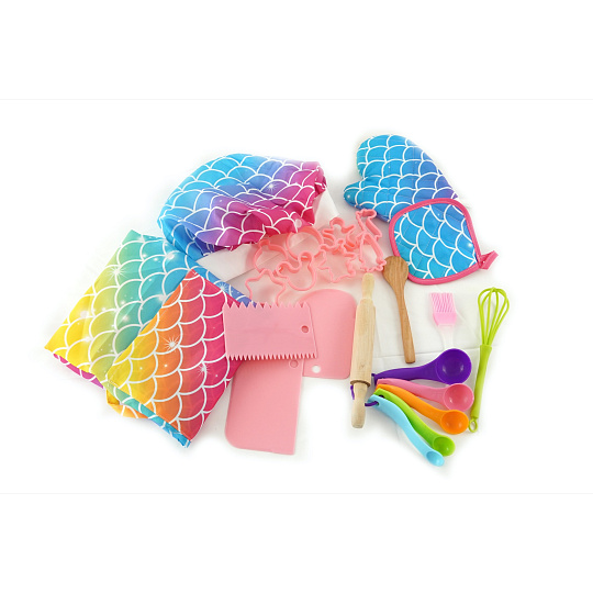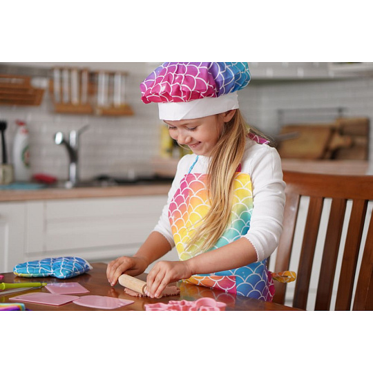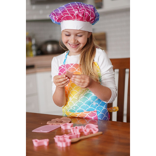 Sada na pečení pro holčičky obsahuje zástěru, kuchařskou čepici, chňapku, vykrajovátka, odměrky, váleček, měchačku, metličku,…. Vše v barvách duhy.
