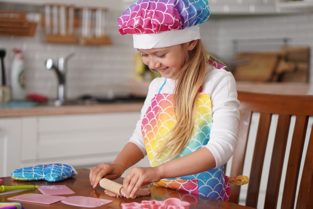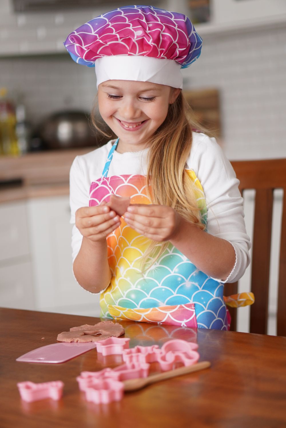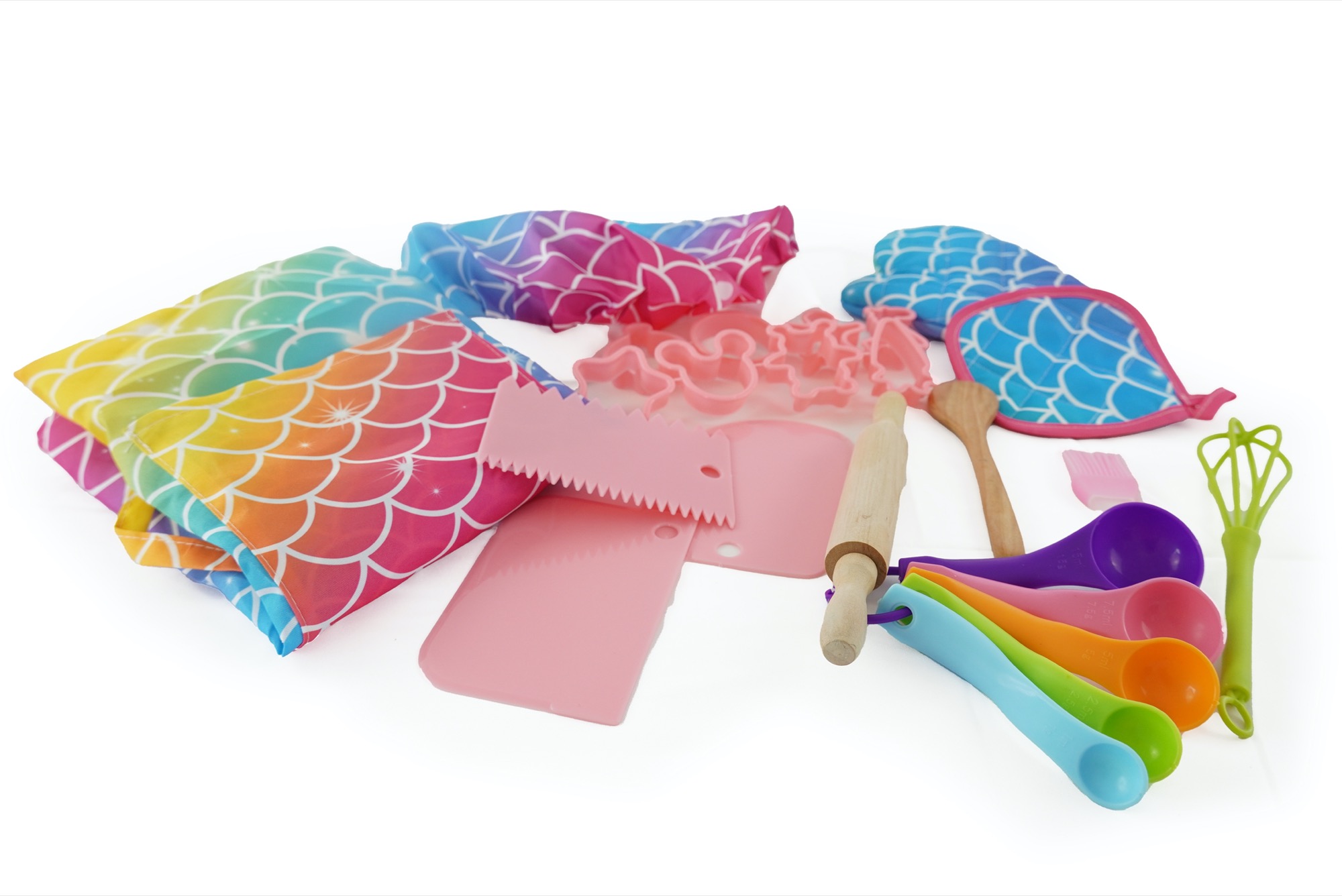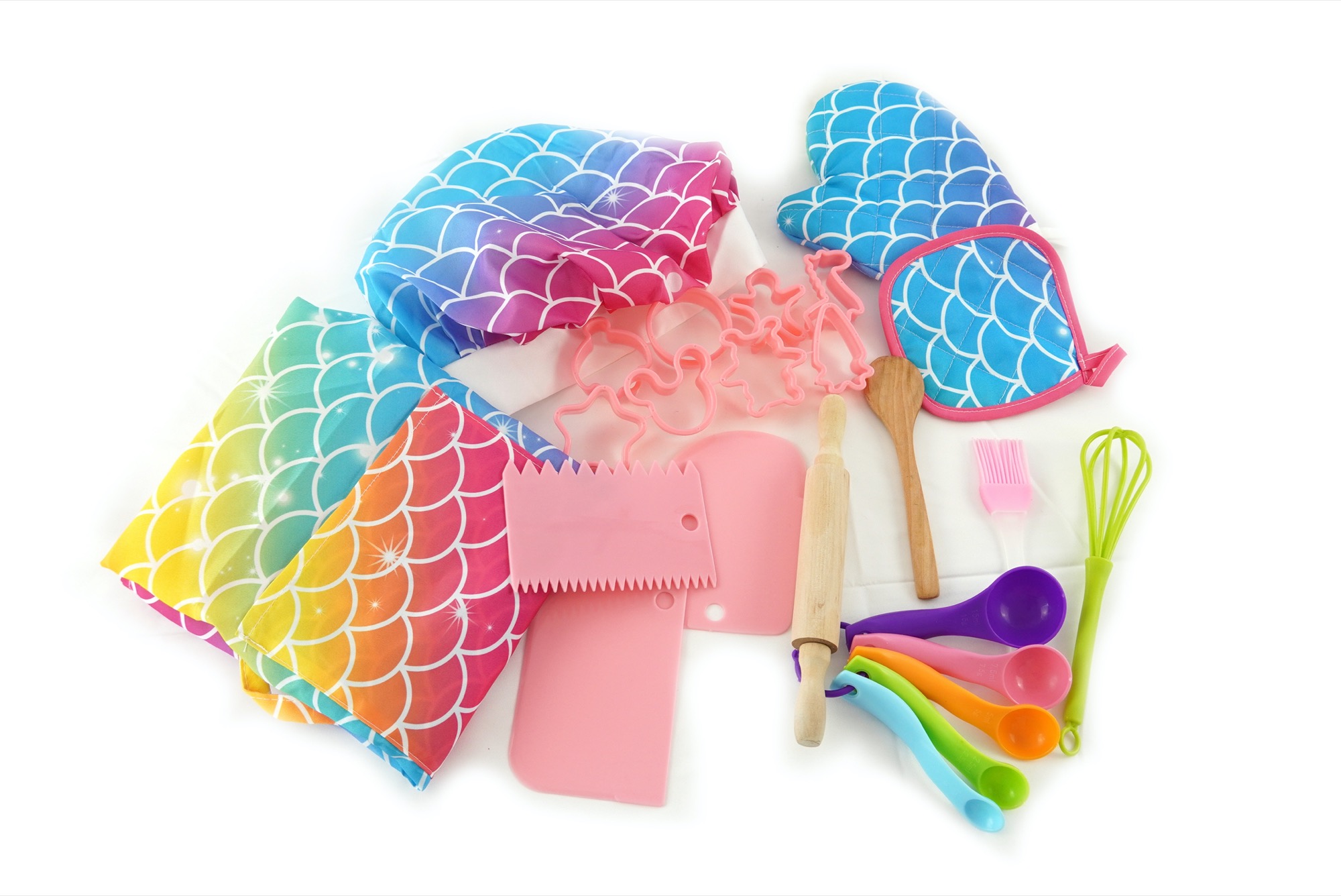 Sada na pečení pro holčičky obsahuje zástěru, kuchařskou čepici, chňapku, vykrajovátka, odměrky, váleček, měchačku, metličku,…. Vše v barvách duhy.