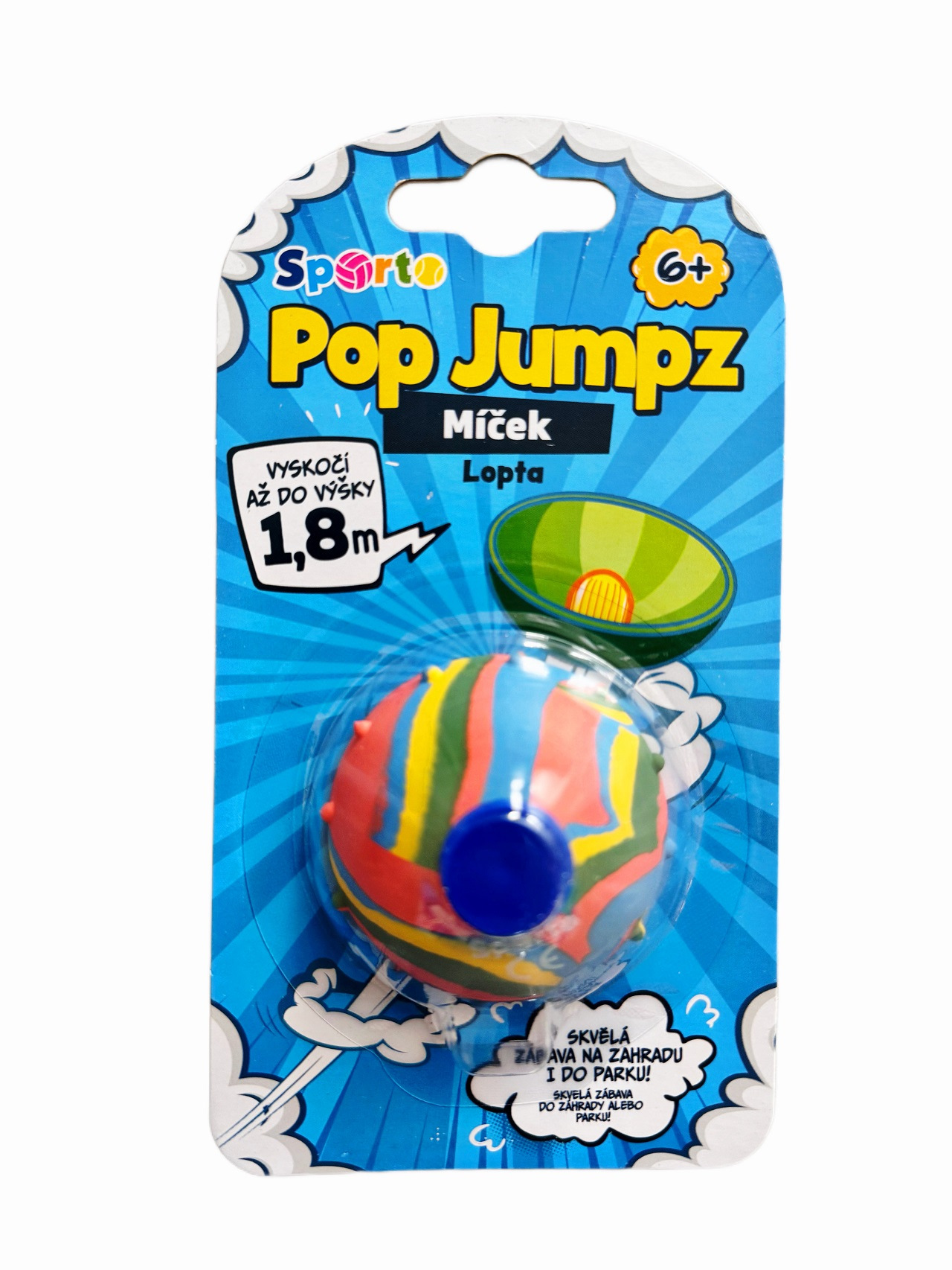 SPORTO Pop Jumpz míček je geniálně jednoduchá hračka, která vás překvapí svým výbušným skokem! Není to totiž obyčejný kulatý míček, ale půlka gumového míčku, která v sobě skrývá neuvěřitelný potenciál pro zábavu a úžas.