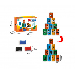 Sportovní hra házení na plechovny. Plechovky mají z jedné strany čísla a z druhé strany různé obličeje. Saž se a shoď co nejvíce plechovek.
