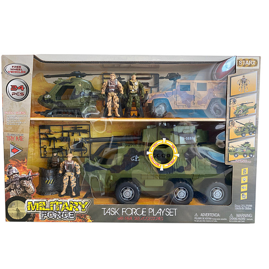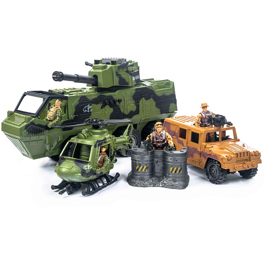 Velká sada vojenských vozidel se zvukovými a světelnými efekty. Sada obsahuje obrněný transporter, helikopteru, jeep, vojáčky a salší příslušenství.
