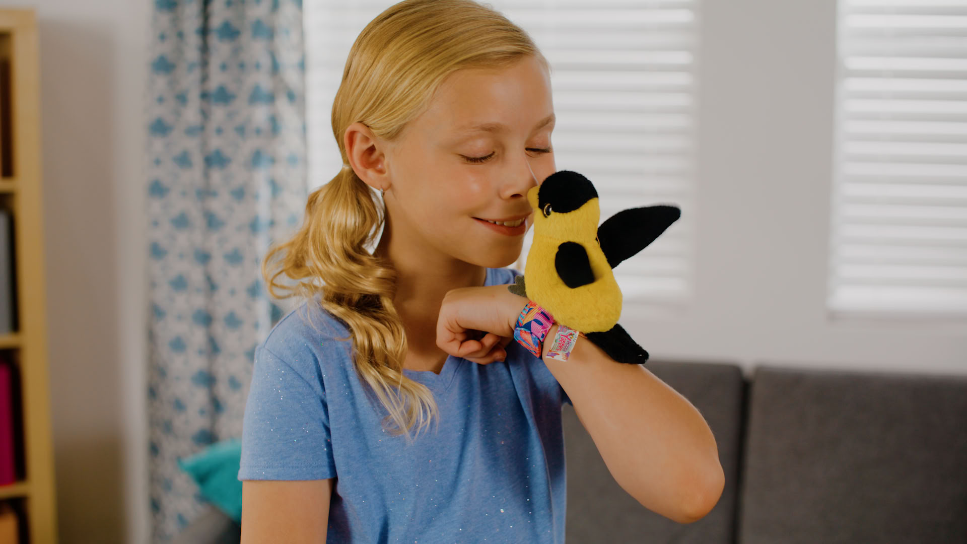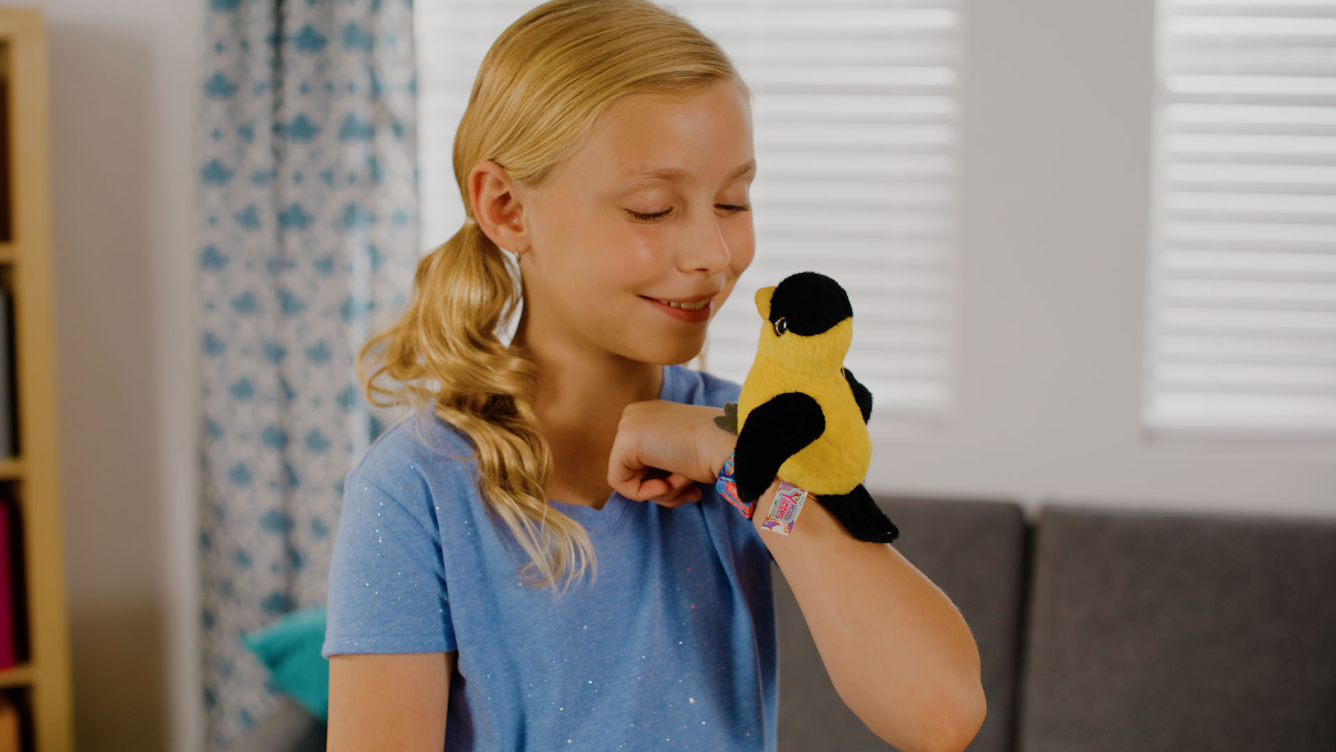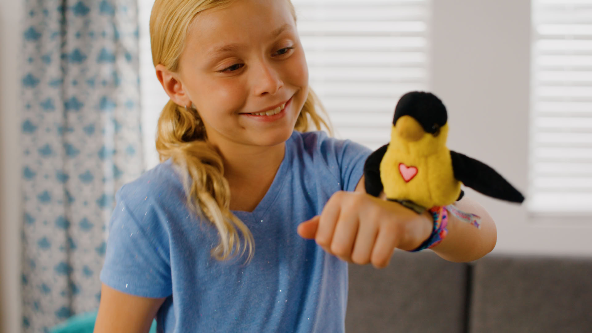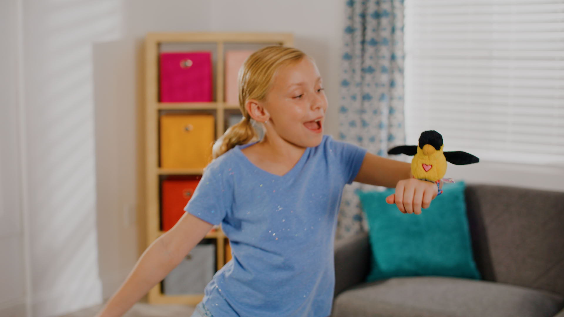 Ptáčka si můžeš připnout na ruku a užít si s ním spoustu zábavy. Opakuje, zpívá ptáčí písničku a mává křídly.