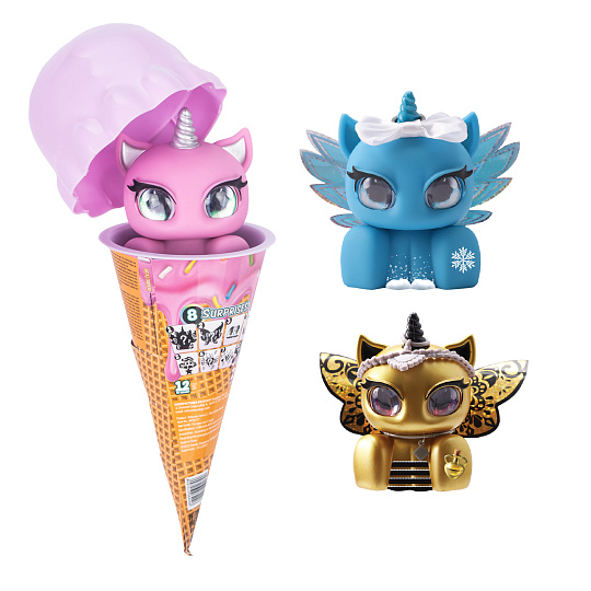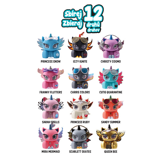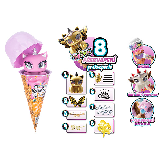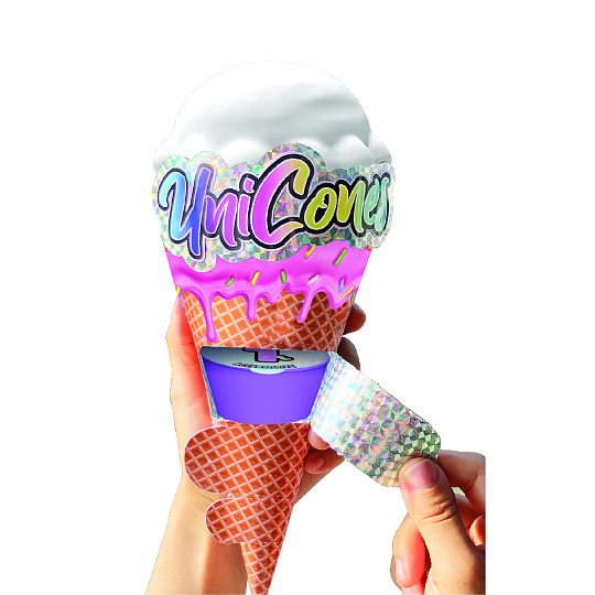 TV položkaPosbírej je všechny. V tomto kornoutu najdeš spoustu překvapení. Kortout se skládá ze 4 částí v nichž je ukryt jednorožec a úžasné doplňky, které si můžete vyměňovat. Samozřejmě nemůže chybět ani sliz.