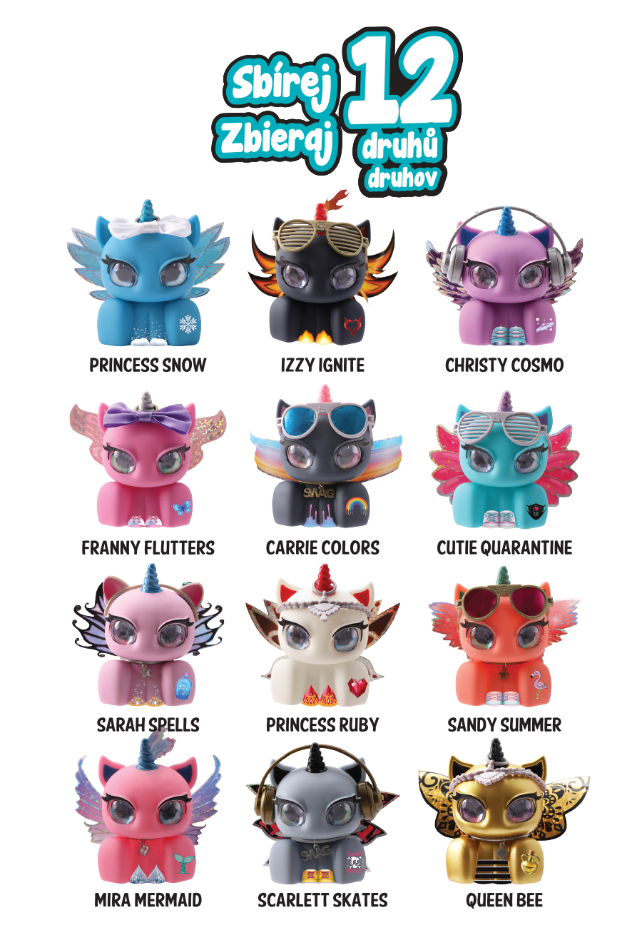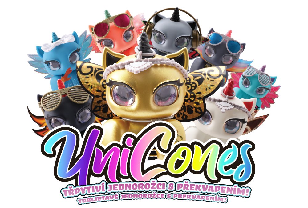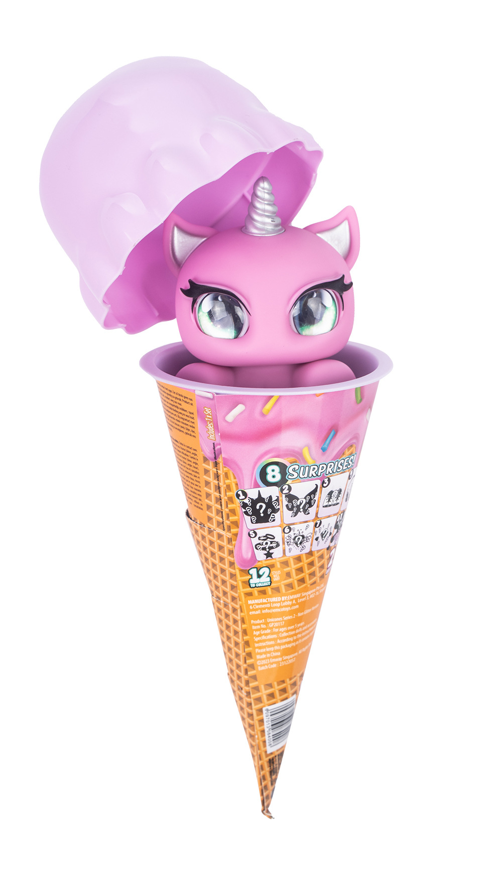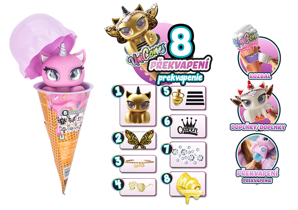 TV položkaPosbírej je všechny. V tomto kornoutu najdeš spoustu překvapení. Kortout se skládá ze 4 částí v nichž je ukryt jednorožec a úžasné doplňky, které si můžete vyměňovat. Samozřejmě nemůže chybět ani sliz.
