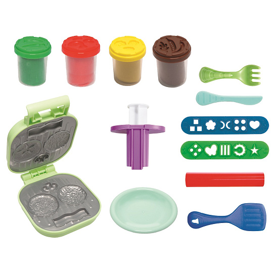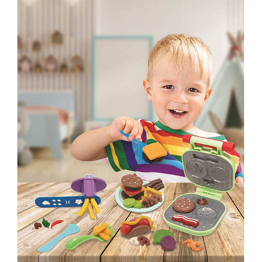 Modelína, ve které jsou různá tvořítka a formičky na výrobu hamburgeru. Včetně modelovací hmoty.