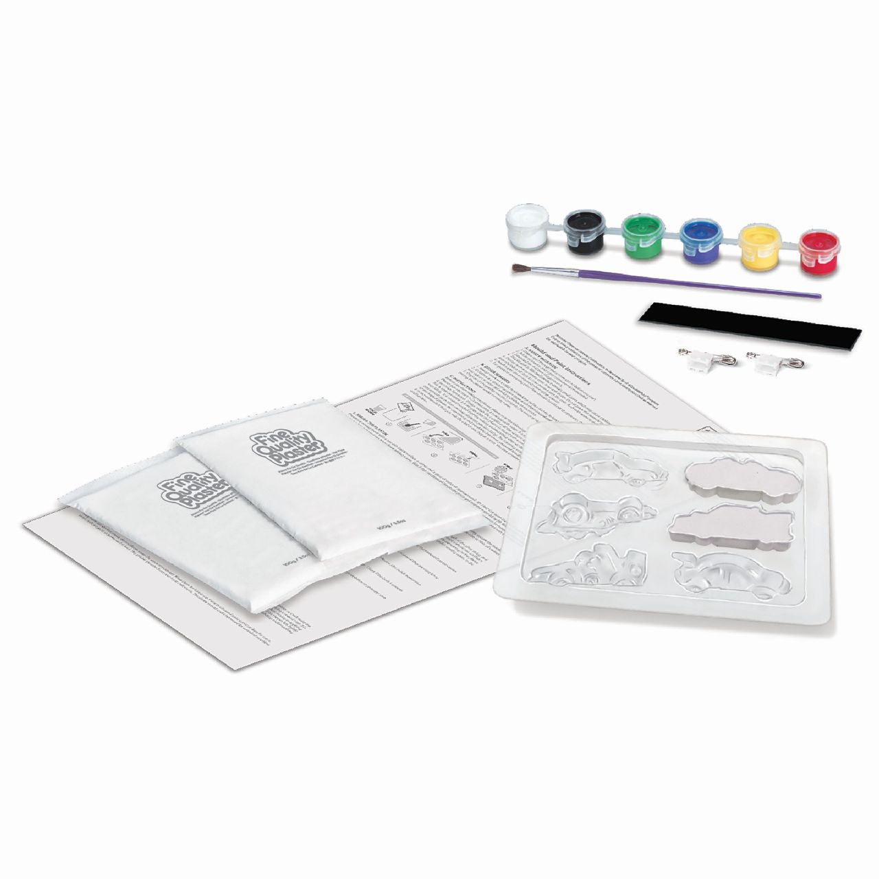 Vytvoř si své vlastní magnety nebo špendlíky pomocí formy, sádrového prášku, barev a štětce, které jsou součástí sady.