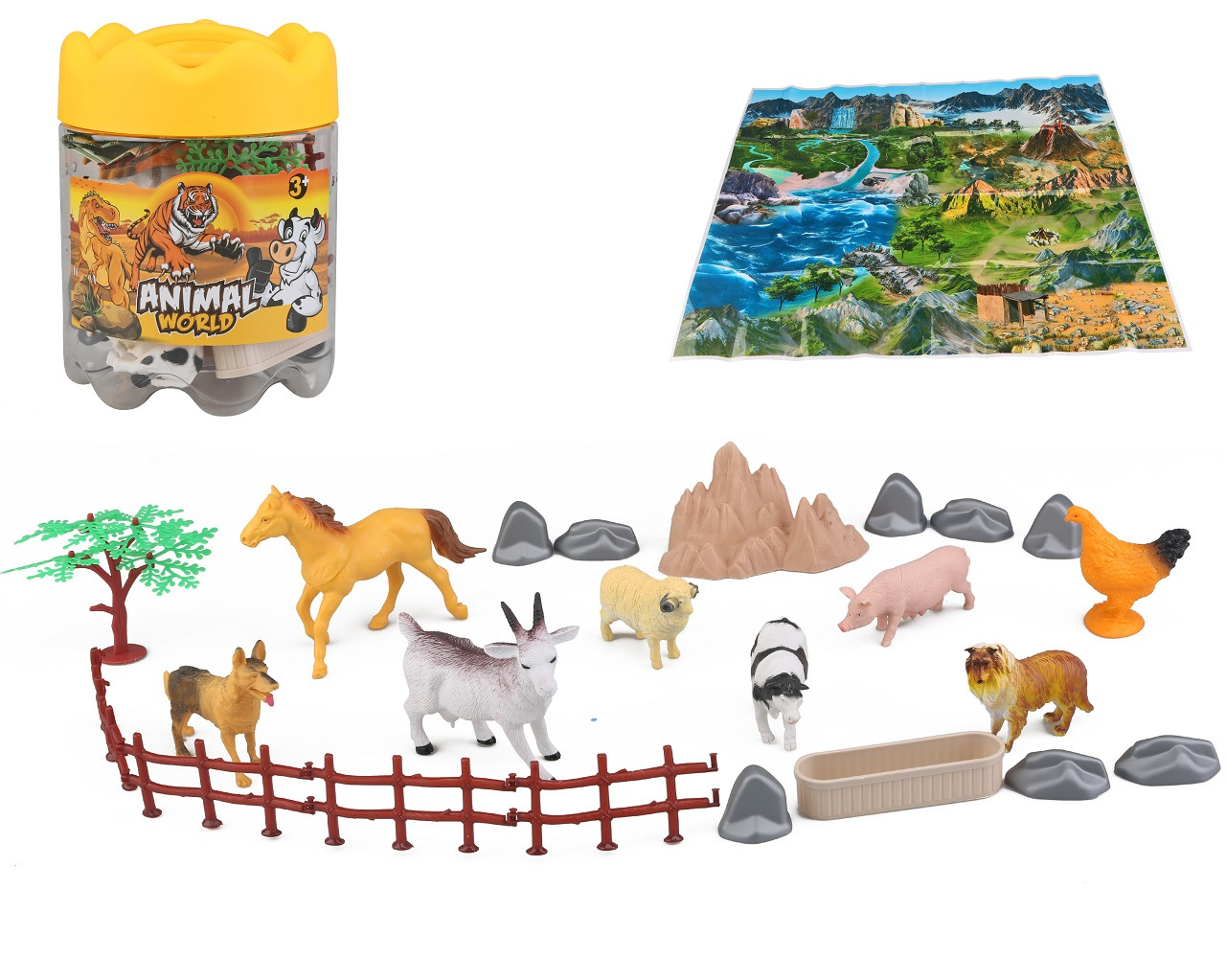 Malá plastová zvířátka, která můžeš vidět na farmě. Zvířátka jsou v přenosném platovém boxu. V balení 25 ks. Balení obsahuje podložka na hraní se zvířátky o velikosti 60x50 cm