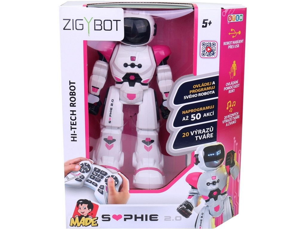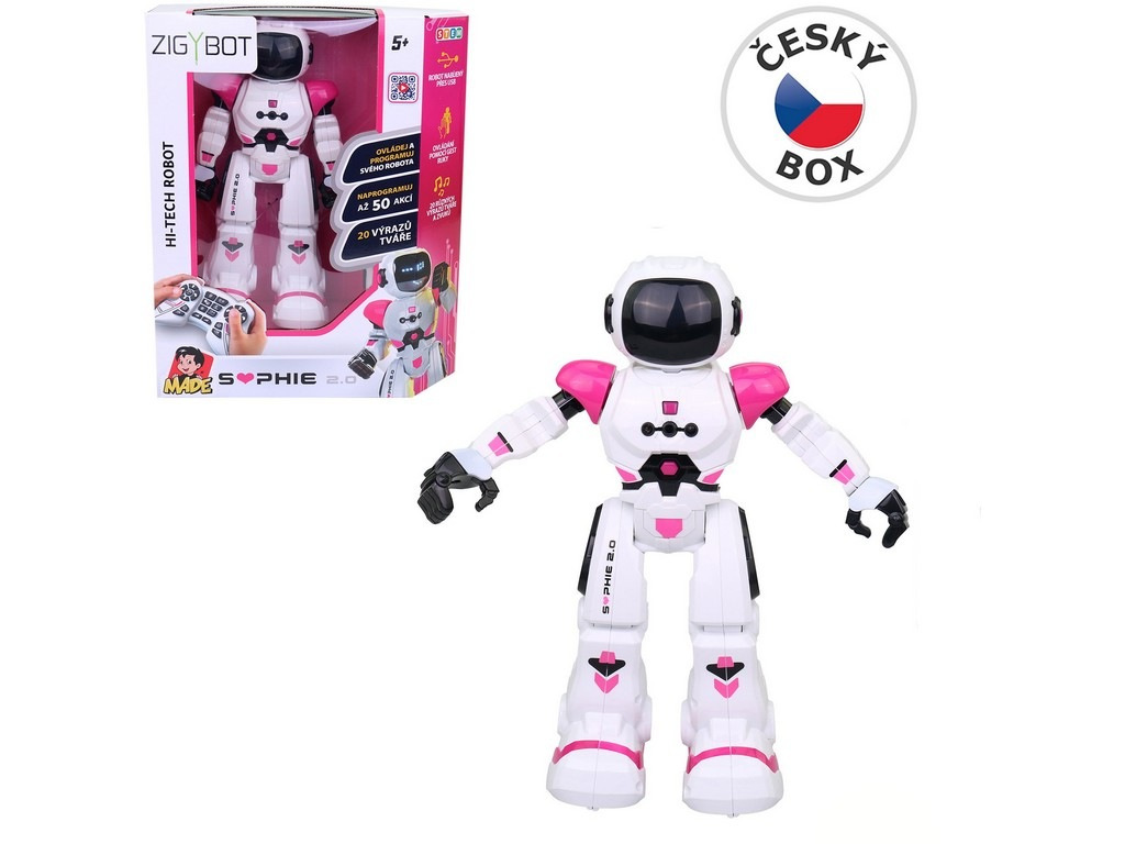 Sophie - Zigybot s novou tváří.Sophie - Zigybot s novou tváří. Robotka Sophie na IR ovládání. Základní funkce: LED diody zobrazují výraz tváře. Sophie ukáže 20 výrazů ve tváři za doprovodu robotických zvuků. Sophie má 4 základní nálady. Naprogramuj Sophie přesně to, co chceš, aby udělala s funkcí programování pohybu. Sophie mluví robotickým jazykem a na Zemi plní robotickou misi společně s dalšími Zigyboty. Zigyboti plní na Zemi tajnou misi, Sophie jí sní pomůže a ty můžeš taky! Sophie už se nemůže dočkat až se bude moci společně s tebou na této misi podílet!