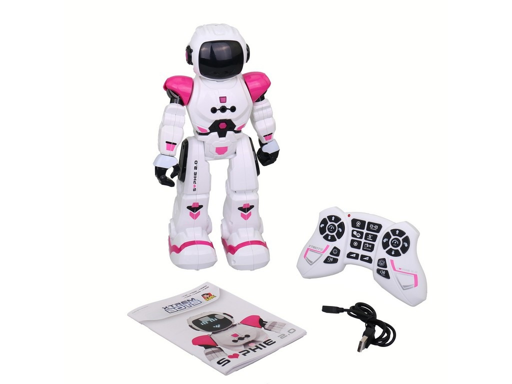 Napájení vestavěných baterií přes USB kabel. Sophie je vhodná pro děti od 5 let. Sophie je možné ovládat nejenom IR dálkovým ovladačem, stejně jako na něj reaguje i na pohyb tvé ruky! Nálada: Stiskněte tlačítko s obrázkem „základní nálady“ na ovladači. Sophie změní výraz svého obličeje a bude vydávat robotický zvuk. Opětovným stiskem tlačítka se bude nálada postupně měnit: Sophie bude šťastná, smutná, rozzlobená překvapená. Stiskněte tlačítko s obrázkem „rozšířené nálady“ na ovladači. Sophie bude měnit výraz svého obličeje náhodně a bude u toho vydávat robotické zvuky. Klíčové funkce robota: - Klouzavý pohyb dopředu, vpravo, vlevo, dozadu - Volba rychlost pohybu - Volba nálady - Volba hlasitosti - Robotické zvuky - Ovládání pohybem ruky - Tanec - Programování - Demo sekvence - Režim robotické řečiBalení obsahuje robota, dálkový ovladač, manuál a USB kabel pro dobíjení. Robota je možné ovládat IR dálkovým ovladačem. Hračka je vhodná pro holky i kluky.