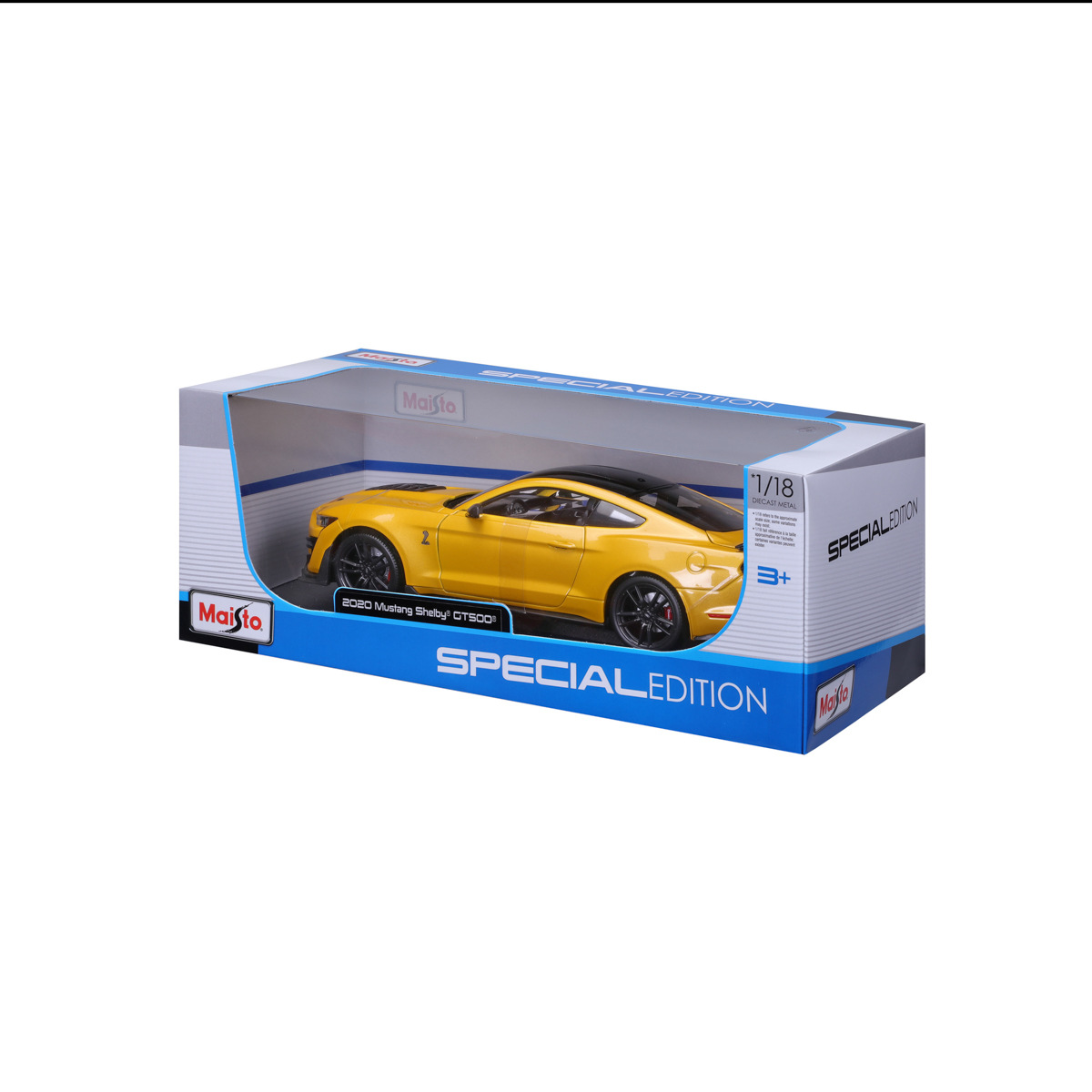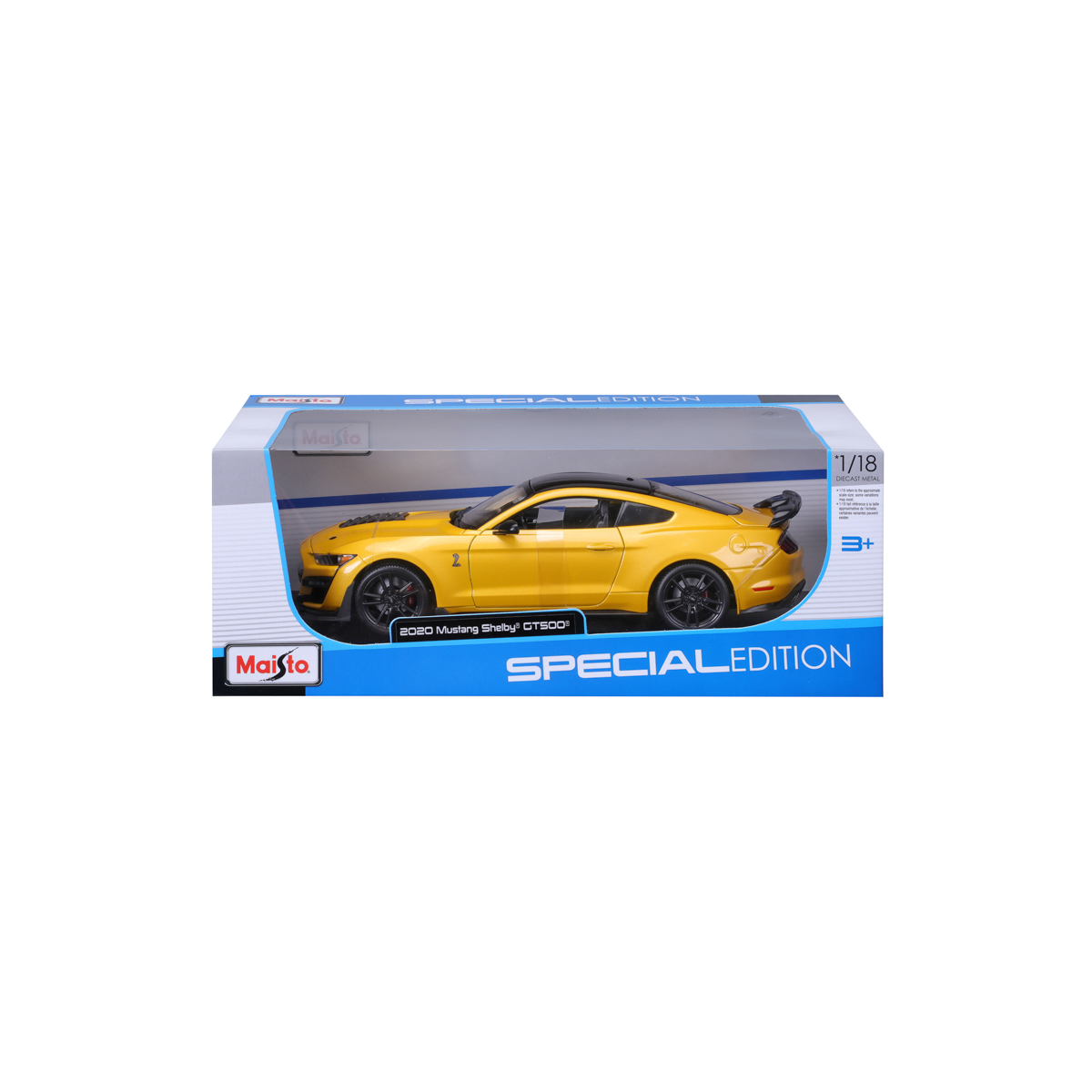 Special Edition 1:18 2020 Mustang Shelby GT500. Modely Special Edition jsou sbírkou krásného designu s vysokým důrazem na přesnost detailů. Modely jsou vyrobeny z litého kovu s plastovými detaily. Většina z modelů Special Edition v měřítku 1:18 má otevírací dveře, kufr nebo kapotu. Navíc disponují odpružením všech čtyř kol, plně funkčním řízením a u některých modelů lze nastavit polohu opěradla. Baleno v krabičce. Nevhodné pro děti do 3 let. Rozměry balení: 12,4 x 33 x 16,4 cm. Věk 3+