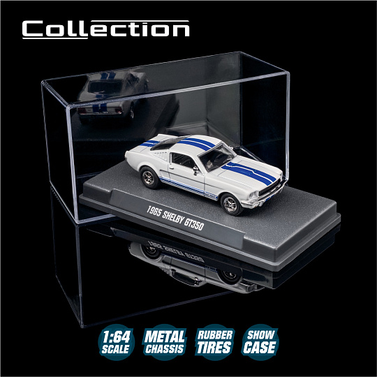 Kovový model autíčka 1965 Shelby GT350, na volnoběh, s díly, které lze otevřít a/nebo s pohyblivými částmi, s odpružením.V měřítku 1:64, délka: 7,5 cm.