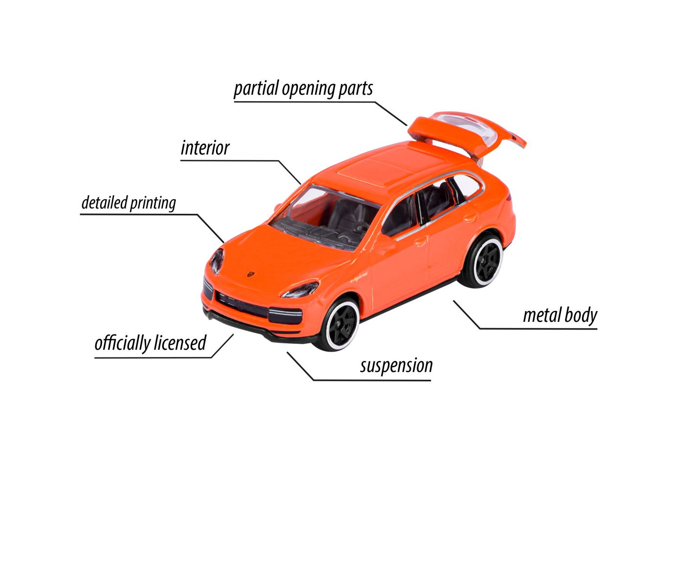 sada Discovery obsahuje 20 různých modelů vozidel Porsche, včetně silničních, prémiových, závodních, historických a policejních vozidel. Obsahuje také 2 exkluzivní záhadná vozidla zabalená ve speciální krabici. Kovová autíčka Porsche v měřítku 1:64 (7,5 cm) mají otočná kola, zavěšení a kloubové části.