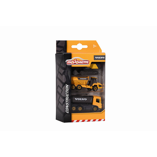 Volvo Edice sada 3 kovových pracovních a stavebních aut na volnoběh (pásové rýpadlo, kolový nakladač, dampr, tahač s korbou, míchačka a sklápěčka), s pohyblivými částmi, 2 druhy. Délka autíčka 7,5 cm.