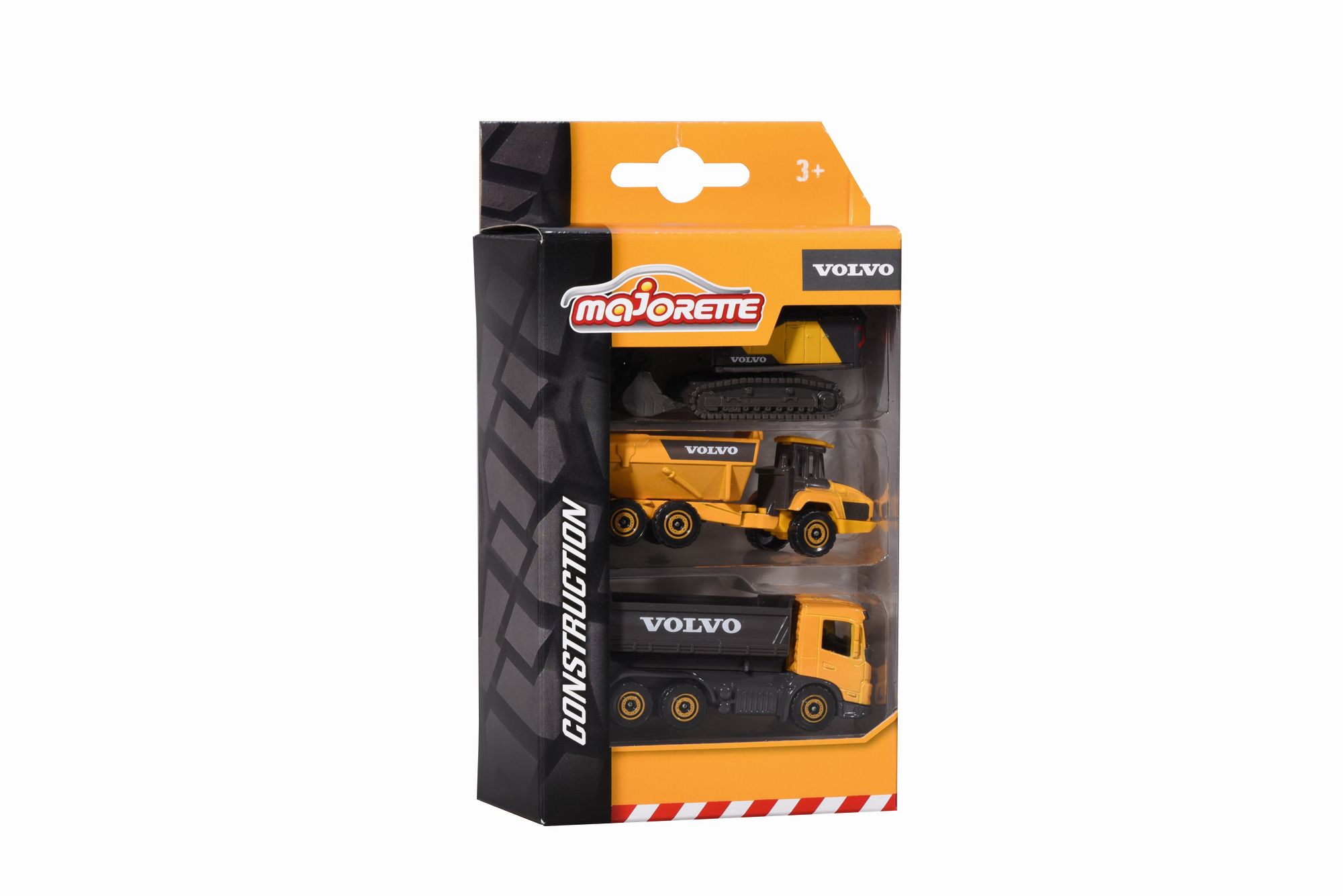 Volvo Edice sada 3 kovových pracovních a stavebních aut na volnoběh (pásové rýpadlo, kolový nakladač, dampr, tahač s korbou, míchačka a sklápěčka), s pohyblivými částmi, 2 druhy. Délka autíčka 7,5 cm.