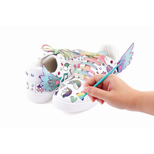 Dočasné tetování pro vaše boty. Dodejte své obuvy šmrnc pomocí dekorativních samolepek. Přidejte jich jen trochu nebo hodně. Proměňte své boty znovu a znovu. Zahrnuje korálkové přívěsky a tkaničky do bot. Přebytečné množství odstraňte teplou vodou. Věk od 8+.
