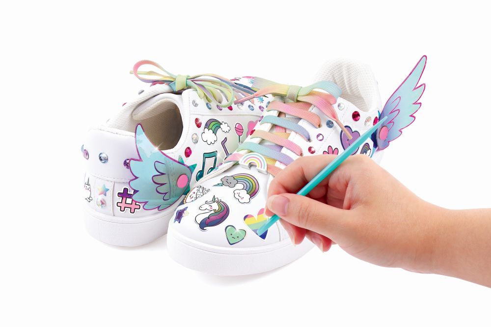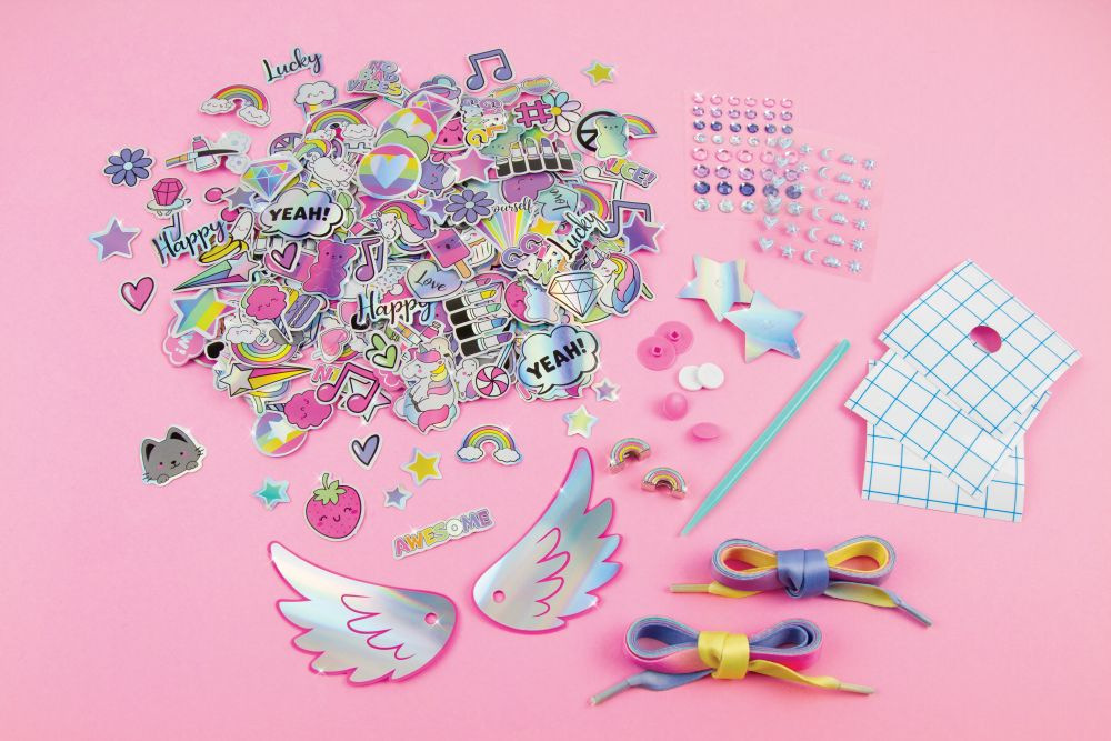 Dočasné tetování pro vaše boty. Dodejte své obuvy šmrnc pomocí dekorativních samolepek. Přidejte jich jen trochu nebo hodně. Proměňte své boty znovu a znovu. Zahrnuje korálkové přívěsky a tkaničky do bot. Přebytečné množství odstraňte teplou vodou. Věk od 8+.