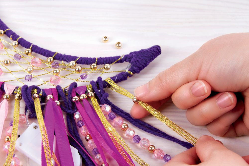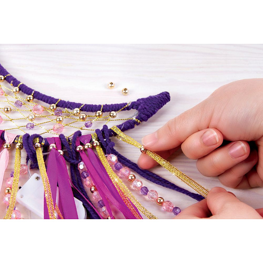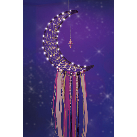 Balení obsahuje konstrukci ve tvaru měsíce, barevné korálky, stříbrnou šňůru, barevné provázky, peříčka na dekoraci, světýlka a instrukce. Vhodné od 8 let.