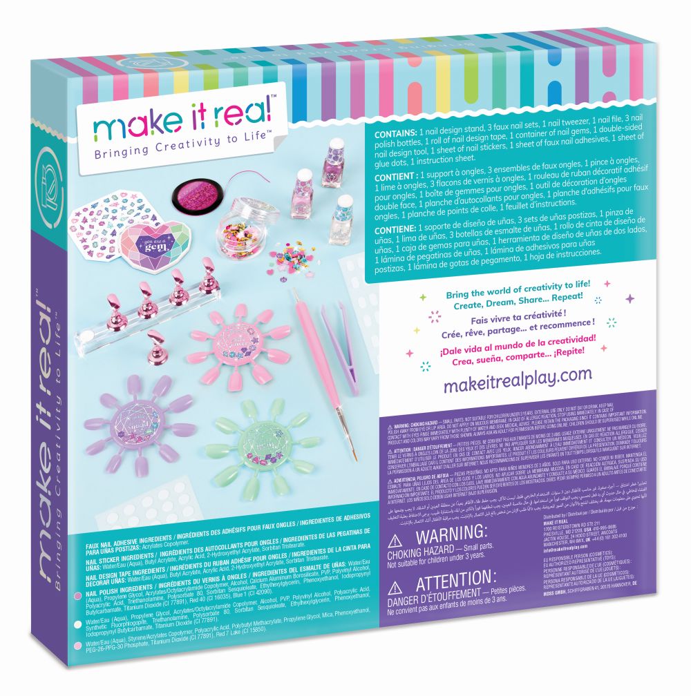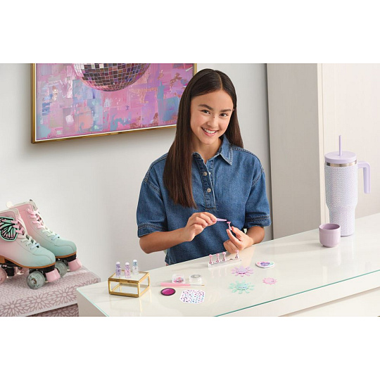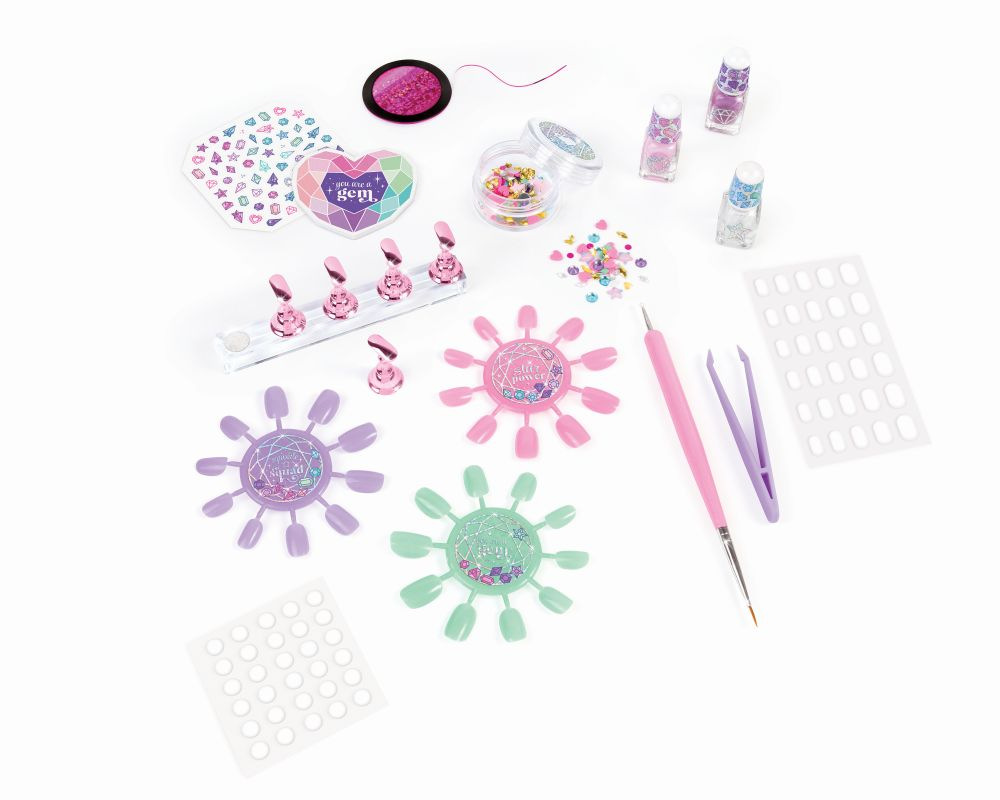 Přineste bling! Vytvářejte úžasné vzory zdobené drahokamy pomocí umělých nebo přírodních nehtů. Pomocí stojanu na design nehtů umístěte číslice pro design nebo připevněte přiložené umělé nehty a ozdobte je lakem, fóliovou designovou páskou, drahokamy a nálepkami na nehty. Pomocí praktického oboustranného nástroje pro navrhování mohou děti vytvářet zábavné tečkované a vlastní návrhy. Mladé módní modelky mohou pozvednout svůj styl s touto kompletní sadou na nehty. Ideální pro děti, které hledají úvod do nehtového stylingu a designu, a ideální pro povzbuzení sebevyjádření a kreativity. Je to skvělý tip na dárek, ať už k svátku, narozeninám nebo jen tak! Veškerá kosmetika je testována na bezpečnost pro děti ve věku 8+.