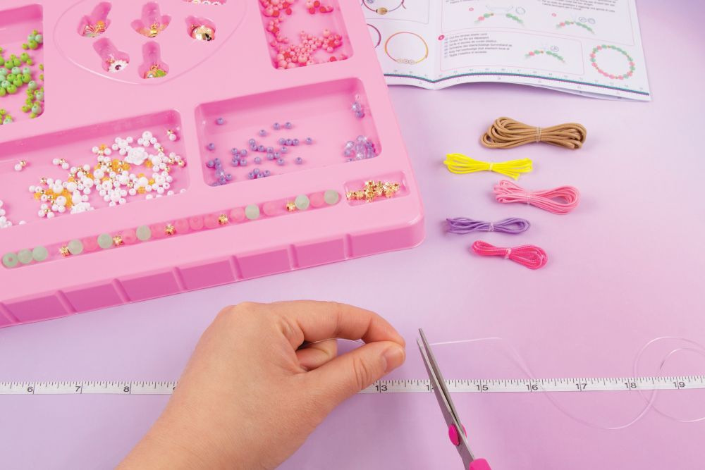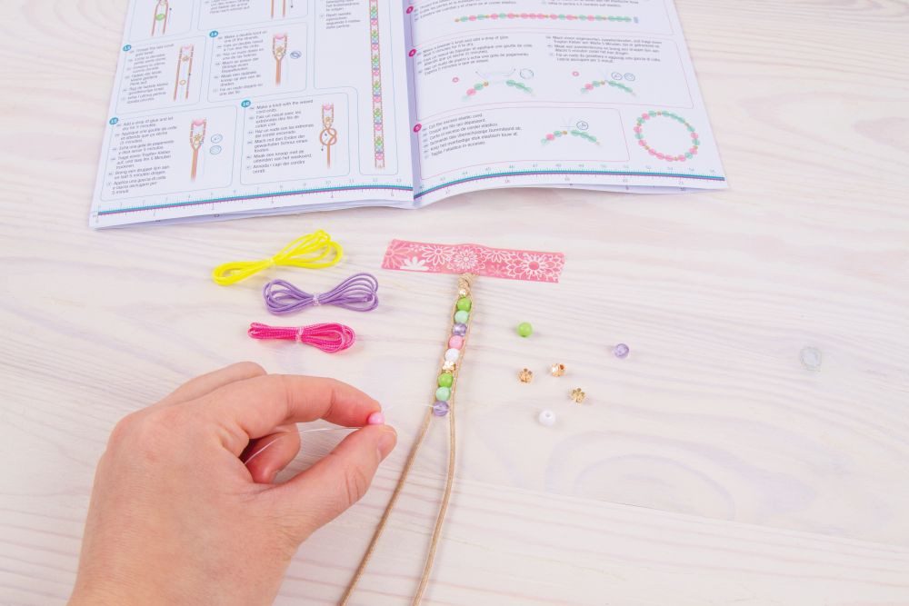 Sada obsahuje 5 barevných šňůr (4,5 m), elastickou šňůru (6 m), korálky, přívěsky s krystaly SWAROVSKI a instrukce. Vhodné od 8 let.