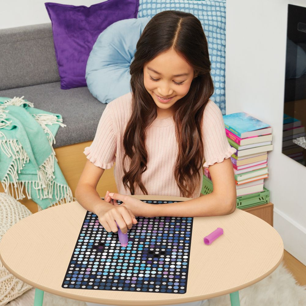 Užijte si uspokojující potěšení z vytváření vlastního tečkovaného plakátu! Podívejte se na razítko na číslo na papírové tečce a na plakátu najděte odpovídající číslo. Zarovnejte kruhy a razítko! Pokračujte v odhalování jednoho barevného tečkového uměleckého plakátu, který můžete zavěsit a užívat si. Každá sada obsahuje vše potřebné k odhalení uměleckého díla se zářícím drakem, včetně razítka, tečkovaných kazet a 600 teček. Zažijte větší spokojenost s každým razítkem a obdivujte odměňující výsledek. Stamp To Reveal™ Satisfying Dot Art je skvělý dárek pro trendy doplnění, ať už k narozeninám, svátku nebo jen tak. Ideální pro věk 6+. Sbírejte je všechny!