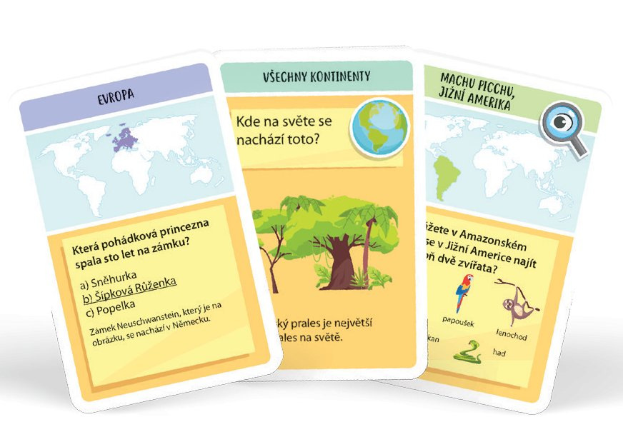 Ve hře jsou 3 druhy úkolů, které řešíte společnými silami - Kde na světě? Najděte to. Víte že…