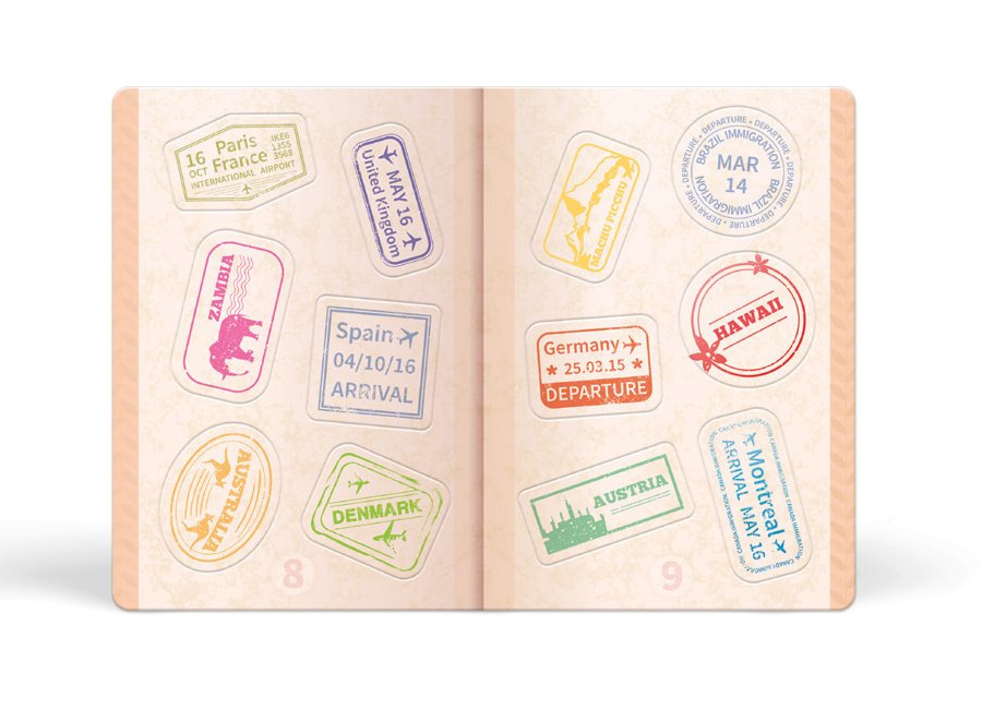 1 cestovní pas + 12 odnímatelných razítek