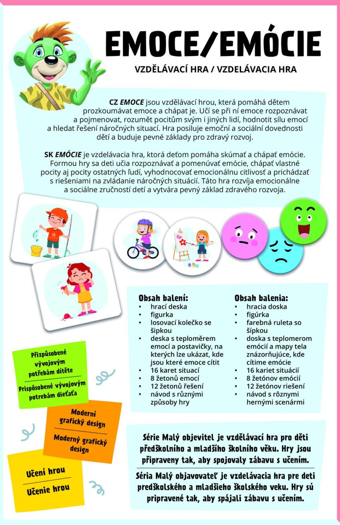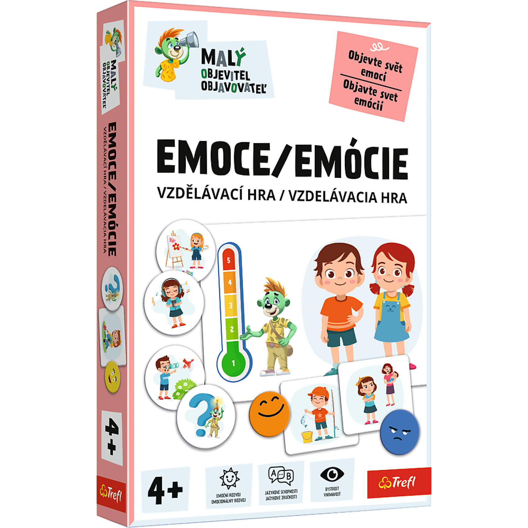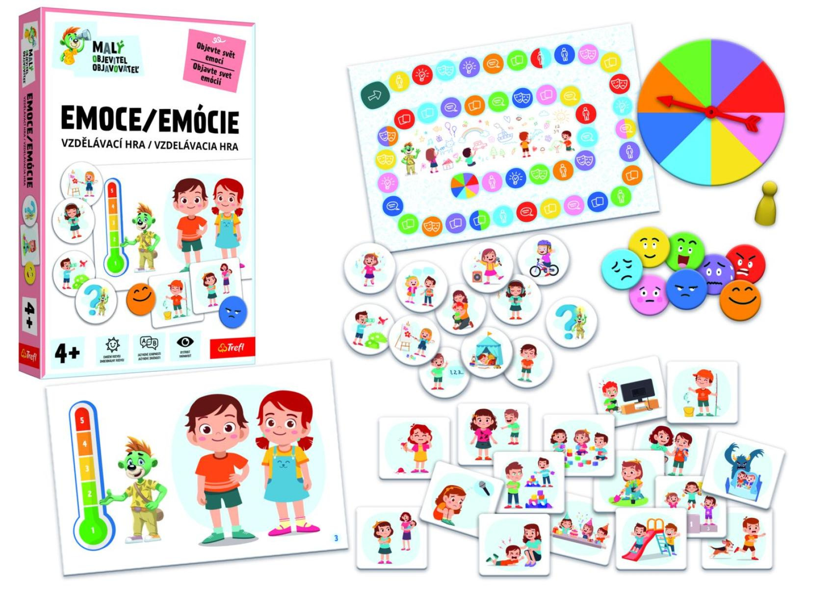 Pomozte dětem lépe poznat, pojmenovat a porozumět emocím! Hra Malý objevitel: Emoce zábavnou formou rozvíjí emoční inteligenci, empatii a komunikační dovednosti. Díky ilustracím a jednoduchým pravidlům je hra vhodná už pro předškolní děti a ideální pro hraní v rodině. Hra získala 1. cenu v kategorii vzdělávacích a kreativních hraček v soutěži Hračka roku 2025. Počet hráčů: 1–4 Rozměr balení: cca 19 × 29 × 4 cm Vhodné pro děti od 3–4 let