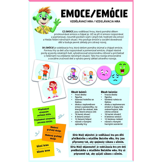 Pomozte dětem lépe poznat, pojmenovat a porozumět emocím! Hra Malý objevitel: Emoce zábavnou formou rozvíjí emoční inteligenci, empatii a komunikační dovednosti. Díky ilustracím a jednoduchým pravidlům je hra vhodná už pro předškolní děti a ideální pro hraní v rodině. Hra získala 1. cenu v kategorii vzdělávacích a kreativních hraček v soutěži Hračka roku 2025. Počet hráčů: 1–4 Rozměr balení: cca 19 × 29 × 4 cm Vhodné pro děti od 3–4 let