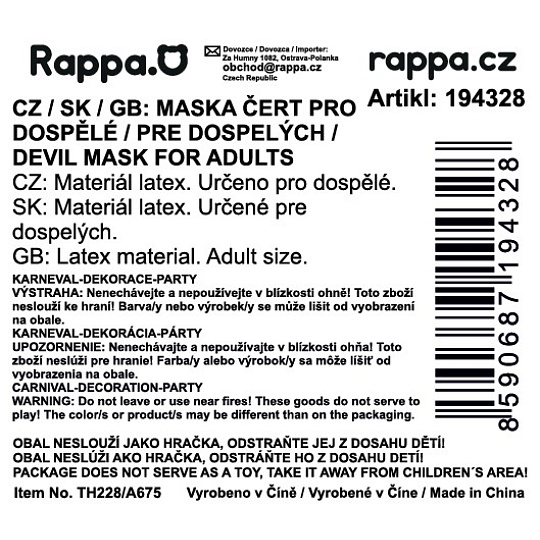 Senzační maska čerta je parádním doplňkem ke kostýmu. Latexová hrozivá maska je v červené barvě s černými vlasy. Vystraš své kamarády touto hrozivou maskou a zažij spoustu legrace.