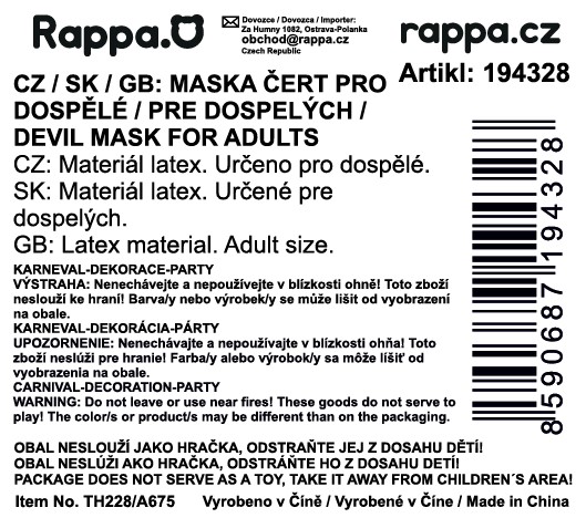 Senzační maska čerta je parádním doplňkem ke kostýmu. Latexová hrozivá maska je v červené barvě s černými vlasy. Vystraš své kamarády touto hrozivou maskou a zažij spoustu legrace.