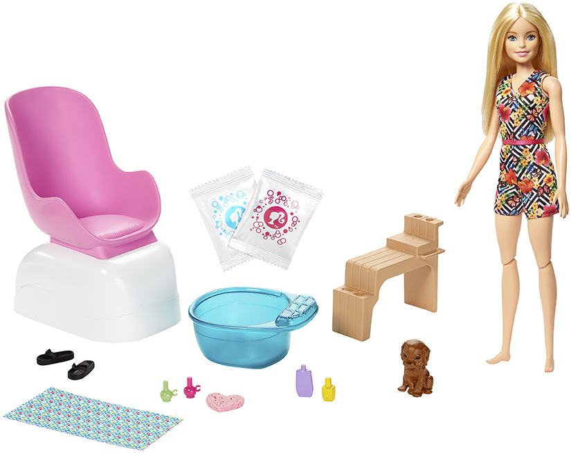 Panenka Barbie® ví, že je důležité o sebe pečovat. Připoj se k panence Barbie® a jejímu štěňátku a nechte se rozmazlovat v nehtovém studiu. Usaď panenku Barbie® do židle a ponoř její chodidla do vodní lázně. Naplň lázeň vodou a přidej jeden ze dvou šumivých sáčků. Co by to bylo za pedikúru bez lakování nehtů. Použij houbu a vodu a změň barvu jejích nehtů. Nezapomeň ani na nehty na rukou. Na dřevěné lavici najdeš všechny potřeby na manikúru a pedikúru a dokonce je tu i dostatek místa pro panenčino štěňátko. Panenka se při této příležitosti oblékla do pohodlného domácího oblečku a pohodlných botek.