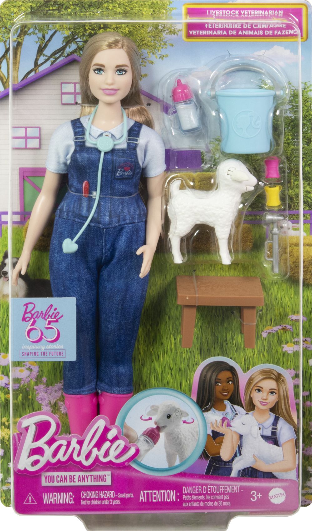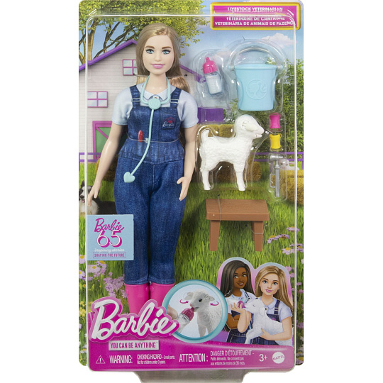 Oslavte 65. výročí panenky Barbie® s kolekcí panenek, které vyzdvihují nejoblíbenější povolání dětí. Panenka farmářka má na sobě profesionální obleček a dodává se s 10 tematickými doplňky, z nichž jeden má zábavnou pohyblivou funkci - ovce při krmení z lahvičky vyplázne jazyk a zdvihne uši! Prodávají se samostatně dle aktuální nabídky. Panenka neumí samostatně stát. Barvy a vzhled výrobku se mohou lišit.