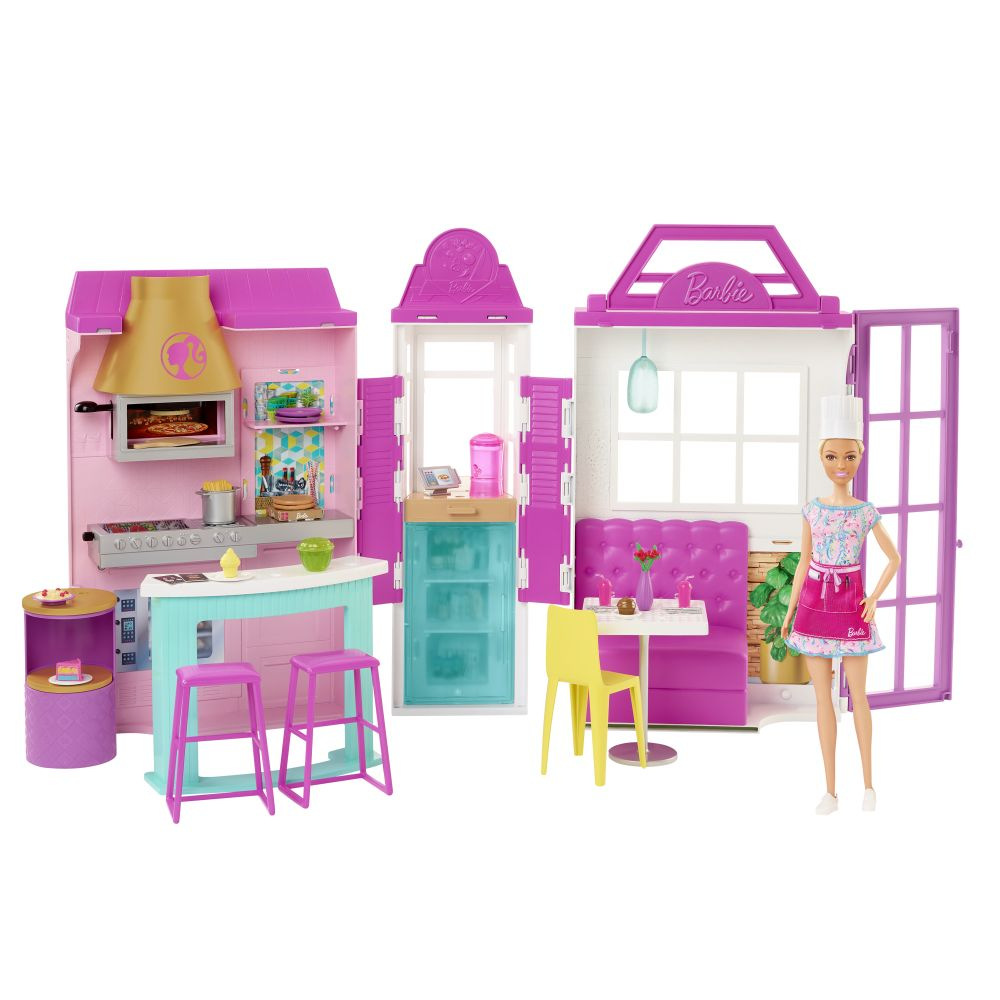 Malí gurmáni si s panenkou a herní sadou Barbie® Restaurace herní set ukuchtí spoustu zábavy a příběhů! Tato herní sada z prostředí rychlého občerstvení má moderní barevný design, šest hracích ploch a obsahuje celkem více než 30 dílů. Zažehne tak v dětech jiskru pro nekonečnou zábavu plnou fantazie. Panenka Barbie® je připravená na den plný práce i hraní v šatech, roztomilé růžové zástěře a kuchařské čepici. Děti jí mohou pomoci přijímat objednávky u výdejního okénka nebo usadit až čtyři hosty do vnitřního posezení u pultu, případně do boxu na zahrádce. Potom mohou zamířit do kuchyně obracet burgery na otočném grilu, aranžovat zákusky na otočném dezertním pultíku nebo dát pizzu do pece a dívat se, jak mění barvu, když je „upečená“! Díky celkem více než 30 dílům a mnoha příležitostem pro vyprávění příběhů si mohou děti ve věku od 3 let hrát s panenkou Barbie® na kuchařku, servírku, zákaznici nebo na všechny tři najednou! Panenka nemůže stát sama. Barvy a vzhled se mohou lišit.