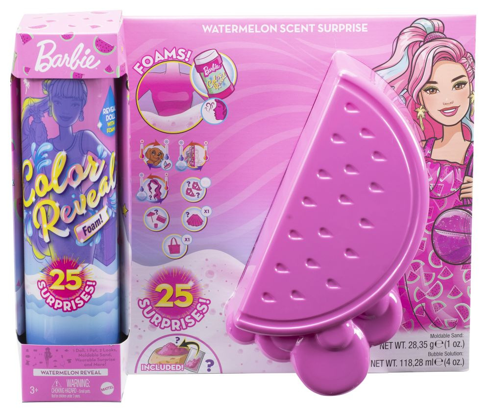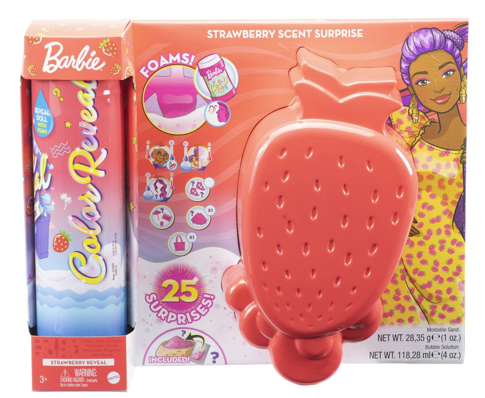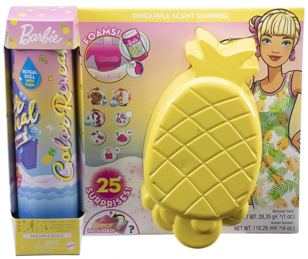 Barbie® Ultimate Color Reveal ™ přináší dokonalý zážitek z rozbalování a spoustu překvapení! Panenka s trendy módou je zaručena, ale vzhled každé panenky zůstává záhadou, dokud není odhalen. Jednoduše nalijte vonný bublinkový roztok do přiložené tuby dokud se nevytvoří pěna, která odhalí panenku Barbie® Color Reveal ™! Balení je součástí zábavy - použijte blistr ve tvaru ovoce jako pěnový bazén, po velkém odhalení jej naplňte bublinkovým roztokem a přidejte trochu vody pro úžasnou pěnovou párty! Kolekce nabízí tři různá ovocná témata - ananas, meloun a jahodu - s 25 překvapeními, jako jsou prodloužení vlasů, oblečky, slunečník, pískoviště a kinetický písek. K dispozici je také skrytý přívěsek, který dívky najdou v písku, a který se připevňuje k přiloženému náramku. Každá panenka má jinou kombinaci vlasů, tónu pleti a plavek. Děti je mohou sbírat, kombinovat doplňky, najít všechny skryté přívěsky a rozšiřovat možnosti hry! Prázdnou tubu využijte na uložení panenčiných doplňků nebo jiných hraček. Každá panenka se prodává samostatně, v závislosti na dostupnosti. Panenka nemůže stát sama. Barvy a dekorace se mohou lišit.