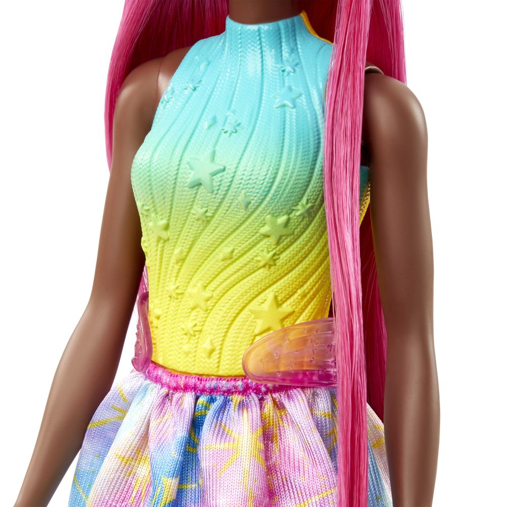 Tato pohádková panenka Barbie® mořská panna má extra dlouhé a pestrobarevné růžové vlasy! Děti si mohou svou mořskou pannu upravit pomocí přiložených vlasových doplňků, pak ji rozčesat a opakovaně si s ní hrát do nekonečna. Pohádkové prvky, jako jsou živůtek inspirovaný oceánem a ombré ocasní ploutve, dodávají této panence Barbie® mimořád