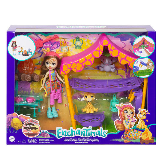 Prozkoumejte Sunny Savanna ™ se žirafou Griselda Giraffe ™ a jejími zvířecími nejlepšími kamarády! Tento herní set Enchantimals Savannah Sleepover ™ je plný her na vyprávění příběhů. Shromážděte se na lavičkách a usedněte u táboráku pro speciální čas sbližování Enchantimals ™ pomocí zábavného příslušenství, jako je kytara, hrnky, lucerny a další. Pak jděte do stanu pro sladké sny Savany! Pod „listovým“ stropním ventilátorem, který se točí, je houpací síť pro žirafu Griseldu, plus 2 postele pro žirafu se jménem Antenna ™ a slona se jménem Stompah ™! Malé děti si budou rády hrát na speciální pouto, které sdílejí přátelé Enchantimals ™! Barvy a dekorace se mohou lišit.