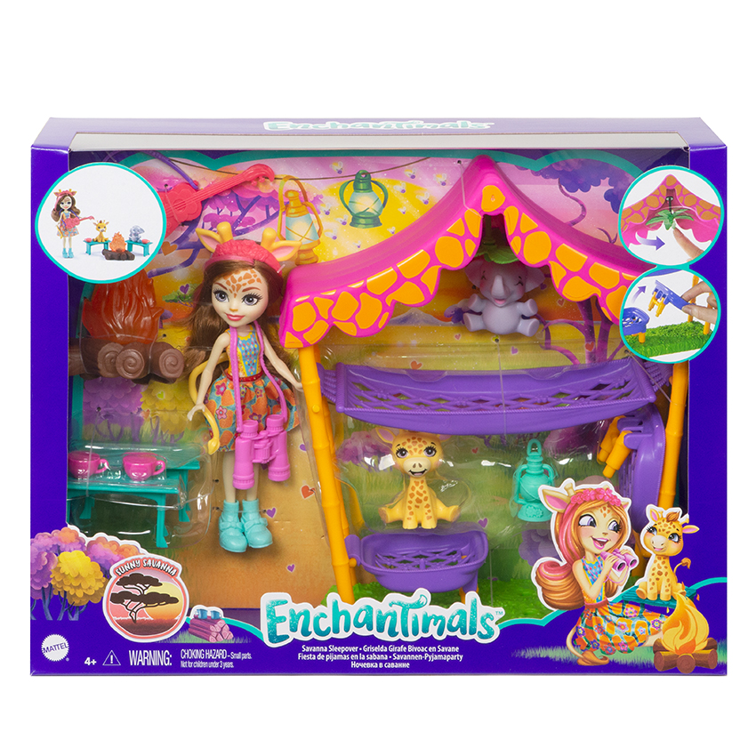 Prozkoumejte Sunny Savanna ™ se žirafou Griselda Giraffe ™ a jejími zvířecími nejlepšími kamarády! Tento herní set Enchantimals Savannah Sleepover ™ je plný her na vyprávění příběhů. Shromážděte se na lavičkách a usedněte u táboráku pro speciální čas sbližování Enchantimals ™ pomocí zábavného příslušenství, jako je kytara, hrnky, lucerny a další. Pak jděte do stanu pro sladké sny Savany! Pod „listovým“ stropním ventilátorem, který se točí, je houpací síť pro žirafu Griseldu, plus 2 postele pro žirafu se jménem Antenna ™ a slona se jménem Stompah ™! Malé děti si budou rády hrát na speciální pouto, které sdílejí přátelé Enchantimals ™! Barvy a dekorace se mohou lišit.