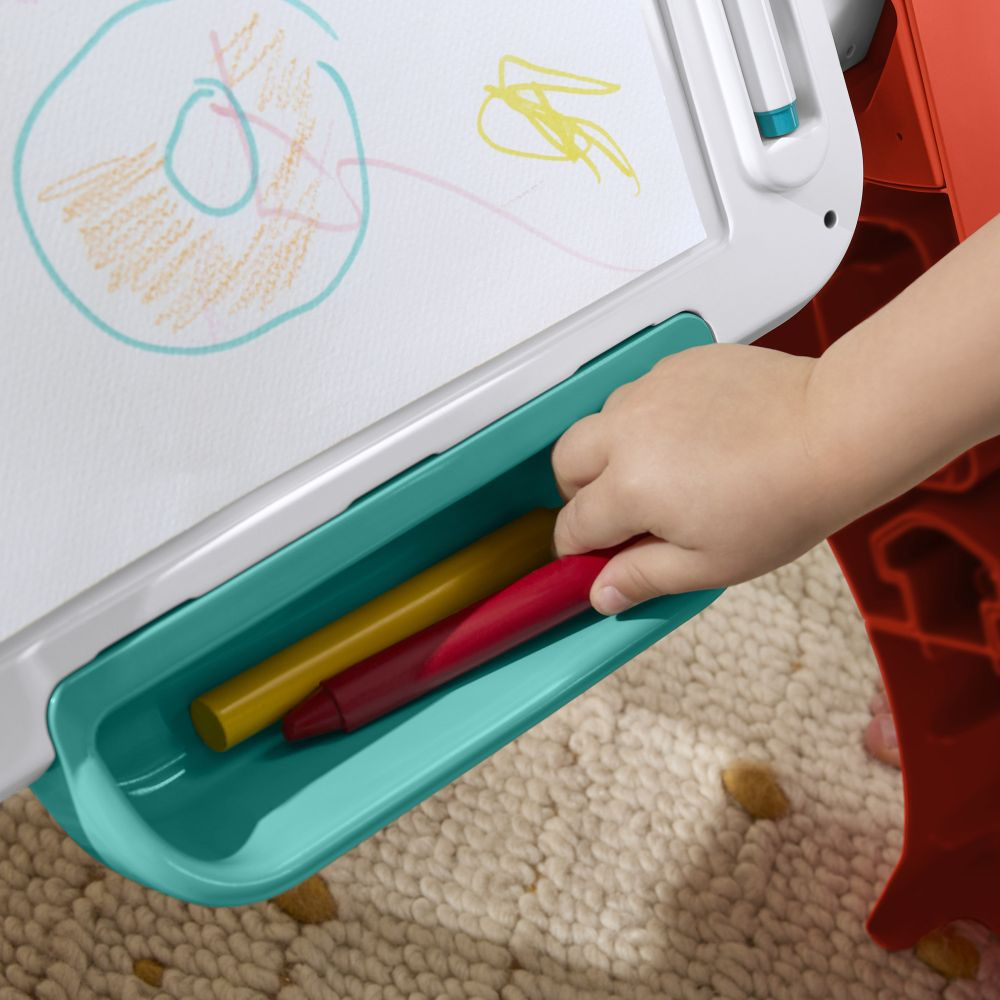 Hrací stoleček a stojan 4 v 1 od Fisher-Price roste s dítětem – je s ním od sezení, přes stání až po tvoření! Interaktivní stoleček nabízí 4 režimy hraní pro děti a batolata - režim pro sedící dítě, režim aktivního stolu pro stojící dítě, režim otevřeného stolu pro batole, které si může přinést knihy, hračky nebo výtvarné potřeby a v neposlední řadě režim stojací tabule pro malé umělce. Aktivní strana obsahuje paletu umělce, která učí čísla, barvy a tvary, točící se barevné kolečko, které aktivuje hudbu, a klasické zábavné aktivity jako otočná knížka, korálková lišta a spinner. Různé úrovně Smart Stages, díky které hračka roste s dítětem, obsahuje více než 125 zvuků, frází a písní. Strana s tabulí má klip na papír, zásobník na výtvarné potřeby a zářezy na stranách pro uchycení fixů a pastelek. Barvy a vzhled výrobku se mohou lišit.